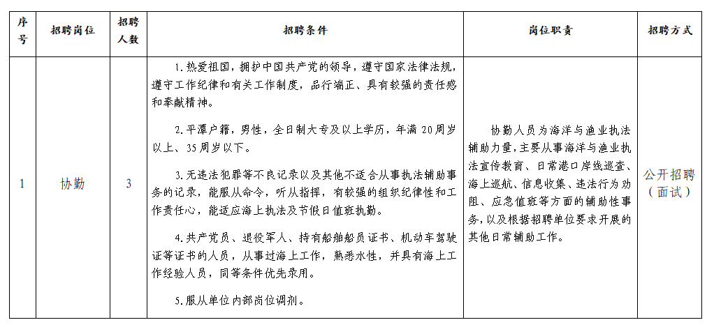 因工作需要,委托平潭综合实验区人才发展集团有限公司面向社会公开招聘3名协勤工作人员,用工性质为劳务派遣,具体事项如下:
