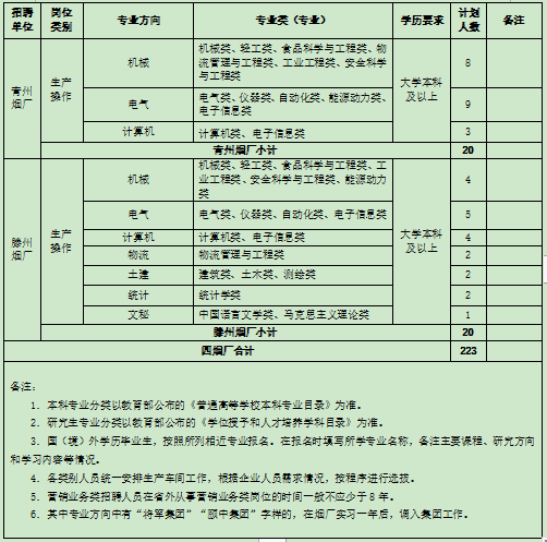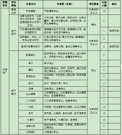 每位应聘者只能报名一个单位、一个岗位类别、一个专业方向,不得多报,多报无效。其中专业方向中有“将军集团”“颐中集团”字样的,在烟厂实习一年后,调入集团工作。