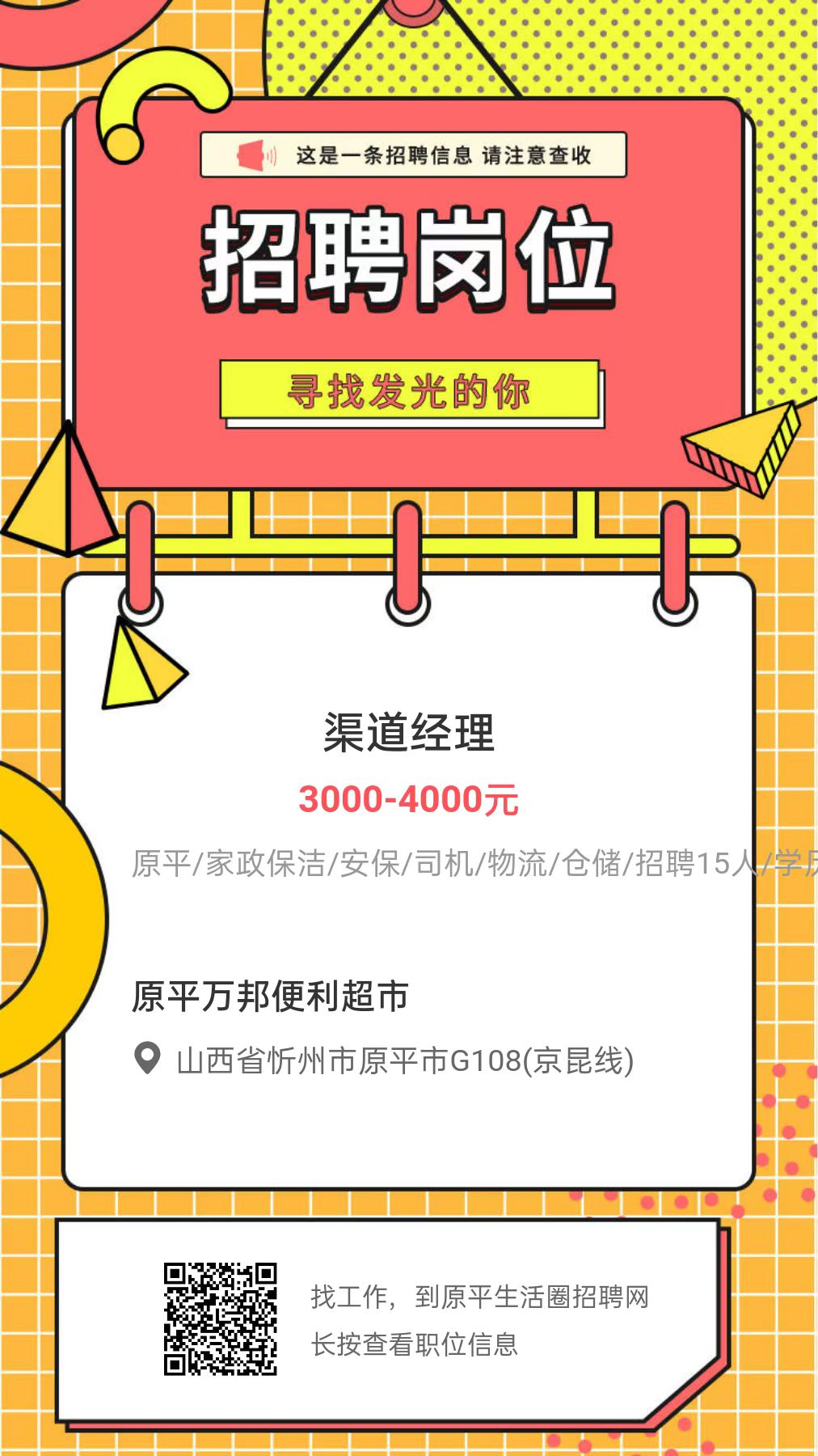 >【最新招聘】原平万邦便利超市招聘渠道经理
