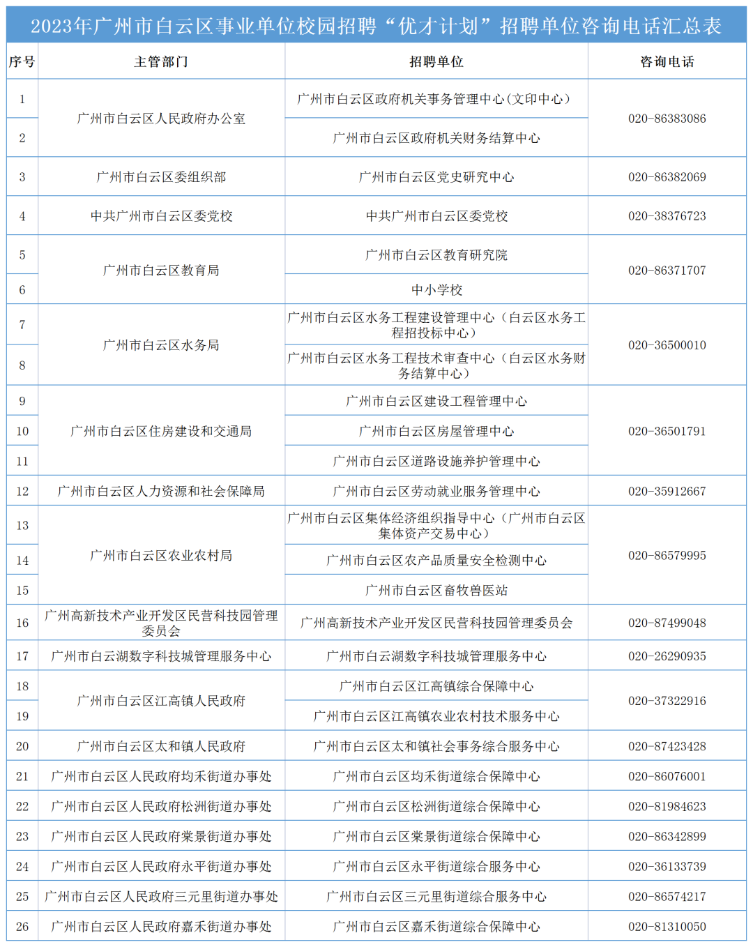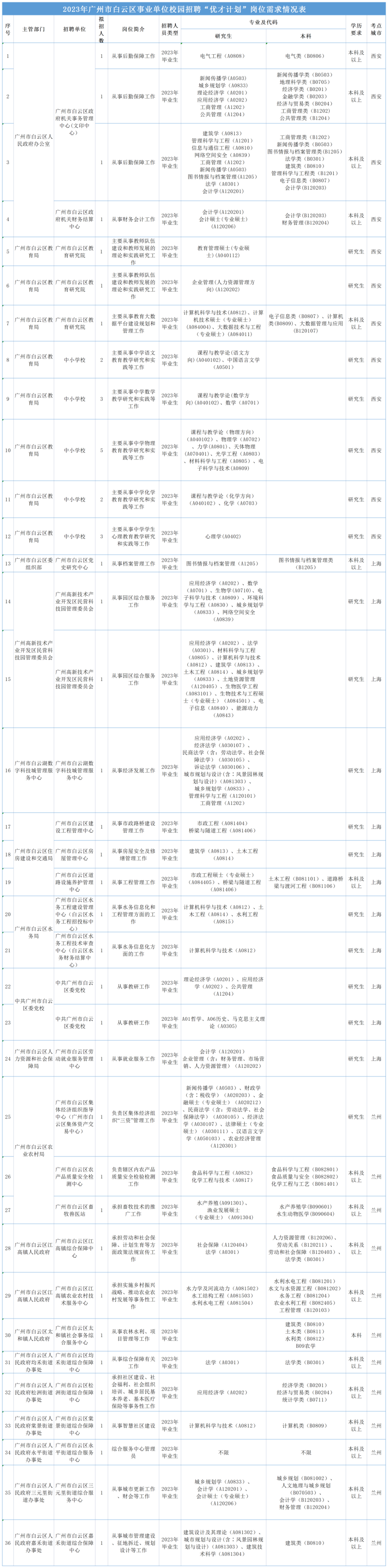 报名确认时间地点:本次招聘初定西安、上海、兰州、广州等城市的高校设现场报名点,视情况可适当调整开考城市,具体时间、地址信息待与高校商定后,在广州市白云区人民政府门户网站(https://www.by.gov.cn/)和当地各高校网站另行补充通知。