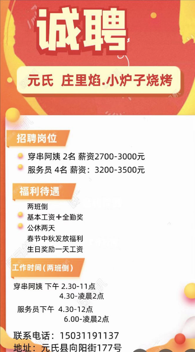 ?综合薪资4000起,另设宝妈班??♀️时间自由?不用打字?有固定话术?没有时长要求?重点无扣罚?从不加班哦?☎电话:17331193771(同微信)15932018383(同微信)招白班阿姨一名,不超50岁,带1周岁小女孩。工资面议。工作地点元氏县毛一村。电话13230162836住宅小区物业工程主管1名:40周岁以下,大专及以上学历;朝都烤肉现招聘服务员、后厨学徒工、配菜、凉菜、主食、刷碗工若干。?招聘:服务员~年龄20至45岁体貌端正,善于沟通表达,有责任心薪资3000➕?后厨学徒工、凉菜、主食、刷碗工若干,身体健康,吃苦耐劳。电话联系0311-85971118,180311191113、休假安排:每月3天公休假(节假日不允许休班)。另享受其他带薪休假男女不限,年龄18--40周岁,初中及以上学历,善于沟通,有自营、店长或有一年以上相关销售工作经验者优先录用。定项招聘柜组主任生鲜、食品、男鞋、女鞋、女装、休闲服装项目柜组主任面试地点:元氏县美源购物广场五楼人力资源部,面试时间:每天上午9:00-12:00 15:00-18:00报名电话:0311-84558818 13933850582(李老师)⭕招聘:厨师、服务员、小吃、体貌端正,善于沟通表达,有责任心。⭕学徒工、主食工、刨肉工、要求男,工作简单,吃苦耐劳,具体薪资待遇及工休时间面谈美容师3000➕,美容顾问4000➕,前台2800➕【招聘】出纳1名