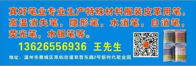 大家好,我厂专业生产服装皮革高温消失笔,隐形荧光笔,生产各种规格紫外线灯,划线机墨水,飞织网布专用荧光笔,小白鞋专用笔,翻毛皮,牛巴,猪巴,羊巴专用荧光笔,在户外不黄变,不发蓝光,质量稳定,可用于皮革,布料,飞织,超纤,有需要联系13626556936王先生。诚邀合作商家,有划线问题,可以免费咨询。专业指导。