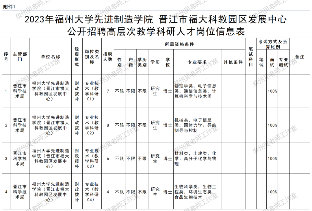1、2023年福州大学先进制造学院晋江市福大科教园区发展中心公开招聘高层次教学科研人才岗位信息表