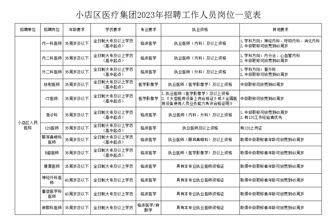 医护招聘温馨提示:山西省太原市小店区医疗集团,2023年招聘内科医师、外科医师、影像医师、急诊重症医师、麻醉医师、康复医师等人才。欢迎人才加入我院!