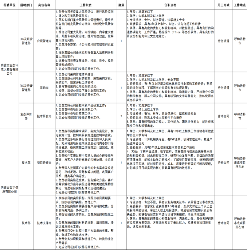 (二)用工形式:本次招聘用工形式分为劳动合同制和劳务派遣制,劳动合同制一经录用与招聘相应单位直接签订劳动合同,劳务派遣制一经录用与内蒙古卓悦人力资源服务有限公司签订劳动合同。