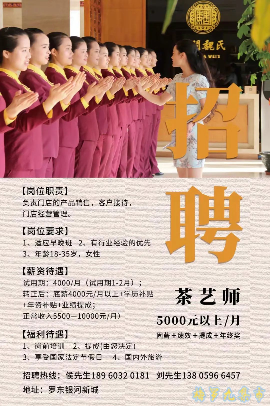 中闽魏氏招聘茶艺师,适应早晚班,年龄18-35岁,女性试用期:综合薪资4000/月(试用期1-2月);转正后:综合薪资4000元/月以上+学历补贴+年资补贴+业绩提成;正常收入5500-10000元/月)【福利待遇】1、岗前培训2、提成(由您决定)3、享受国家法定节假日4、国内外旅游招聘热线:侯先生13505065223刘先生18750551681地址:罗东银河新城【岗位职责】负责门店的产品销售,客户接待,门店经营管理。5000元以上/月固薪+绩效+提成+年终奖禮聘 (侯锦良:13505065223)