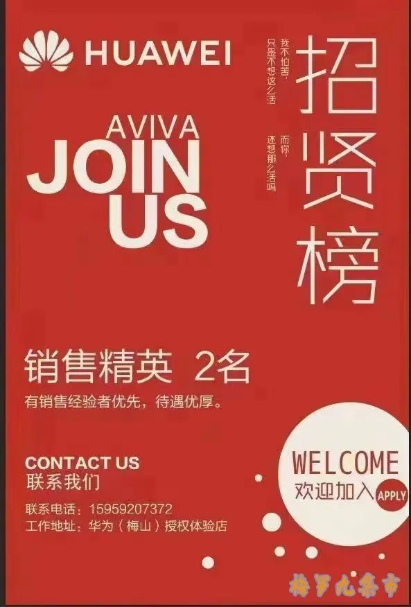 招贤纳士梅山华为体验店现招聘女导购一名,月薪4000~7000(上不封顶)月休4天要求:做事细心!有上进心!有意者请联系我 15880899306(微信同号)地址:梅山光前东街超前超市旁华为授权体验店 (阿鲤鲤鲤?:15880899306)