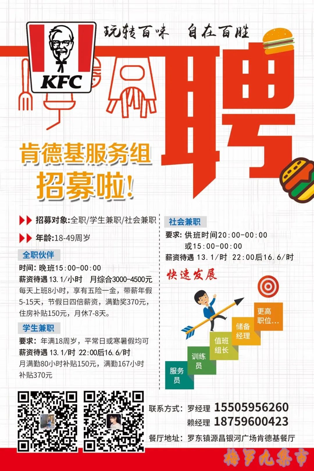 银河广场肯德基现招募后区服务员一名上班时间15:00-00:00工作内容:厨房亨炸烤制等产品制作时薪13.1/时 月综合薪资3000+有意向可直接联系我[太阳] (Yep.:18759600423)