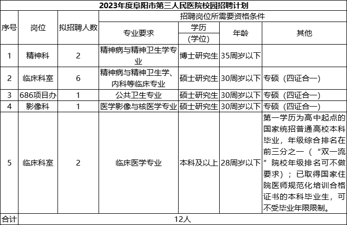医护招聘温馨提示:安徽省阜阳市第三人民医院,2023年度招聘精神科医师、影像医师、临床医师等人才,报名时间为2023年3月11日。欢迎人才加入我院!