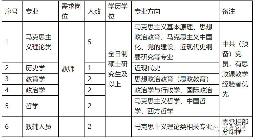 宁夏理工学院马克思主义学院人才引进工作以“立德树人、创新求实”思想为指导,推动思政课教学改革,提高教学科研质量,着眼于建立优秀的思政教师队伍,提升马克思主义学院的影响力。本次招聘面向全社会,坚持“公开、公正、公平、竞争、择优”的原则,按照德才兼备的标准,采取考试加考核的方式进行。二、招聘计划