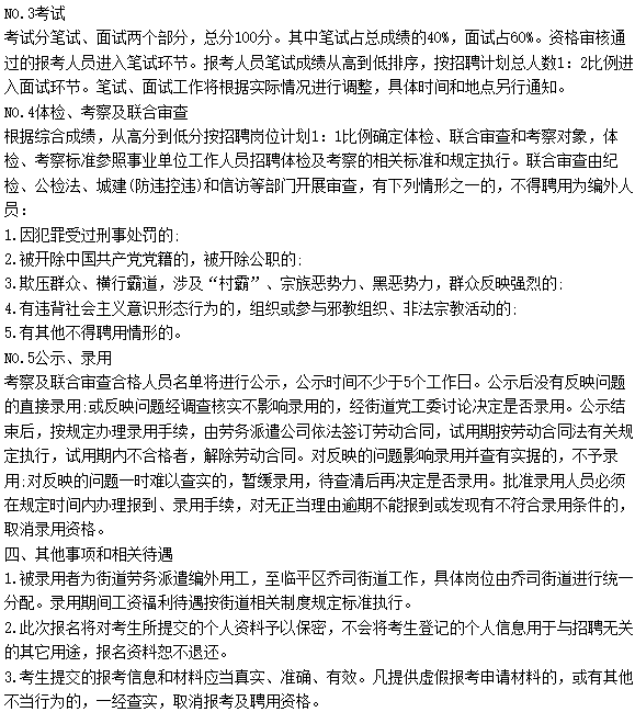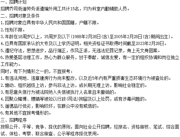 为进一步加强乔司街道社会治安综合治理、社会服务工作,经研究,决定公开招聘劳务派遣编外用工人员,现将有关事项公告如下: