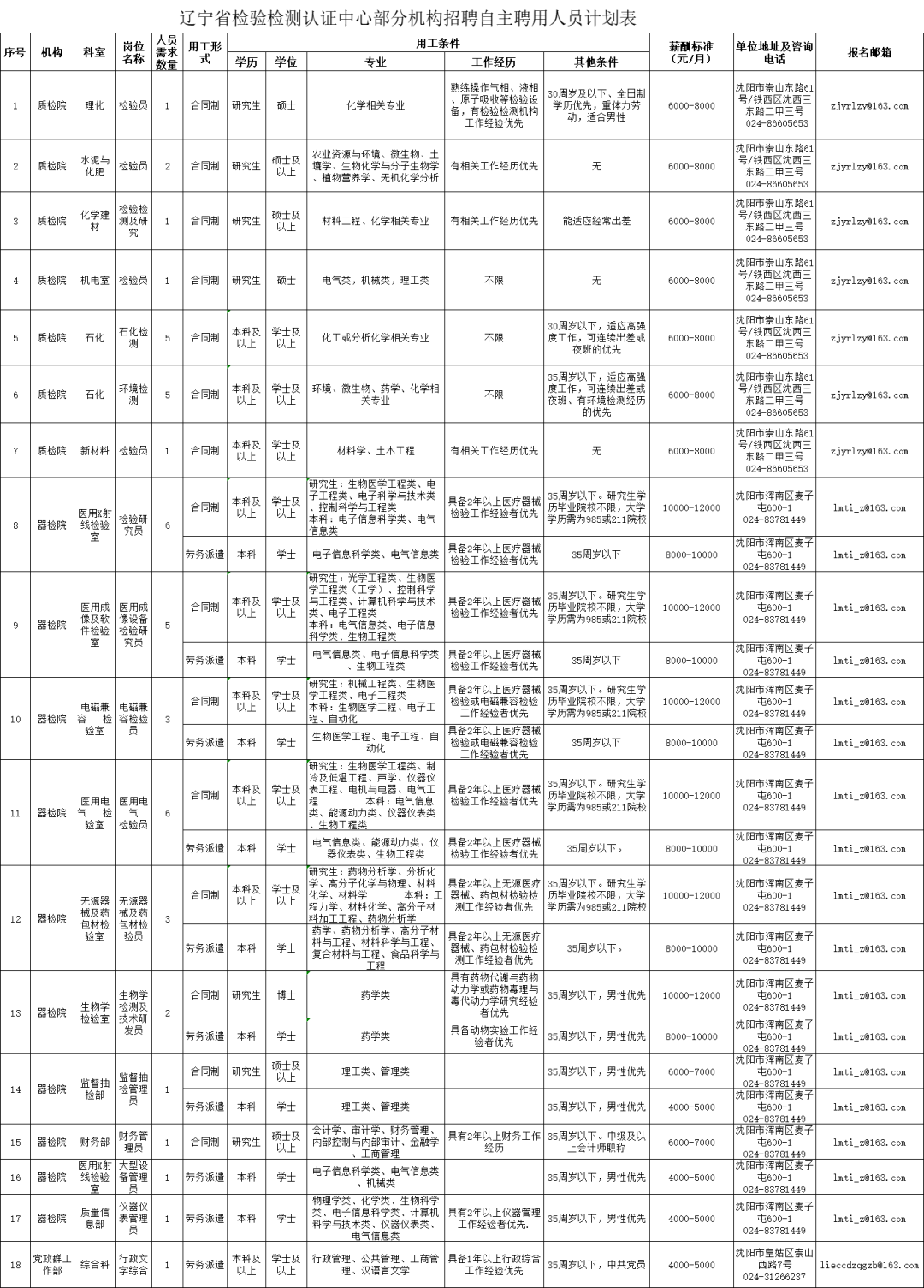 1.辽宁省检验检测认证中心部分机构招聘自主聘用人员计划表