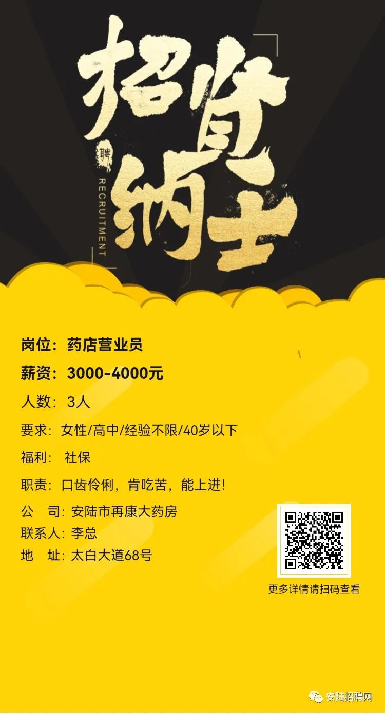 安陆市再康大药房招聘营业员!