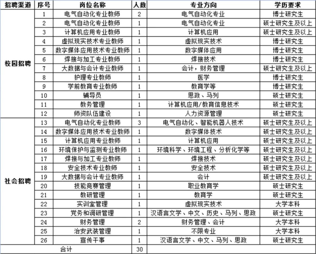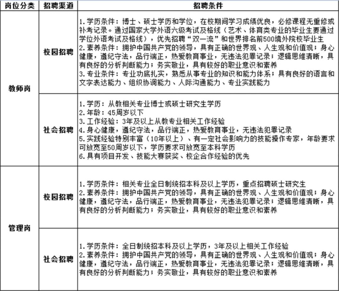 首钢技师学院始建于1954年,前身是首钢技工学校,由首钢集团公司举办,2009年被北京市政府批准成为技师学院,主要开展技工和技师(中职)的教育、培训。学院现设机电工程学院、计算机与媒体艺术学院、管理学院、护理与学前教育等6个全日制教学学院,共计18个招生专业,在校生2901人。 根据学校发展需要,2023年首钢技师学院面向首钢及社会公开招聘应届毕业生17人,社会招聘13人,其中教师岗19人,专业管理岗11人。现公告如下: 一、招聘岗位清单 ![]() ![]() 二、招聘条件 ![]() ![]() 三、招聘流程 ![]() 本次招聘工作人员,经简历初筛、笔试、面试和审查四个甄选环节,根据甄选结果择优确定录用人选。 自公告发布之日接收简历投递,投递截止时间:2023年3月30日。 四、联系方式 ![]() 联系人:李老师 联系电话: 010-59805994 13391670956 简历投递邮箱: liyuxin20201025@163.com 学校地址:北京市石景山区晋元庄路6号。 首钢技师学院 2023年2月 来源:首钢技师学院 本篇内容所有图片,文字如涉及作品版权问题 请第一时间告知,我们将及时删除 本公众号法律顾问由北京市致衡律师事务所律师、高级合伙人安久坤律师担任