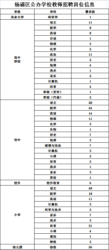 2023年上海杨浦区教育系统教师招聘345人公告(第二批)招聘对象和条件: 招聘对象 1、高校应届毕业生(留学回国人员毕业证及学位证的发放时间在2022年8月1日至2023年7月31日者,视为应届毕业生); 2、社会人员(外省市社会人员须持有上海市居住证一年及以上并在有效期内,计算截止时间为:2023年12月31日)。 招聘条件 01、基本条件 1、拥护中国共产党的领导,热爱社会主义,身心健康,品行端正,具有教师任职的基本素质。 2、热爱教育事业,热爱学生,遵纪守法,德才兼备。 3、原则上应聘初中及以上学段,所学专业应与应聘岗位相符。获得各种学业奖励的优秀师范类应届毕业生或持有对应学科教师专业技术职称的社会人员,可适当放宽专业要求。 4、须具有相应的教师资格证书。 02、学历要求 1、应届毕业生 (1)应聘业余大学教师条件:须具备研究生及以上学历和硕士及以上学位。 (2)应聘高中及中等职业学校教师条件:须具备研究生及以上学历和硕士及以上学位。公费师范生和职业教育可放宽为本科学历和学士学位。 (3)应聘初中、小学、特殊教育学校教师条件:须具备本科及以上学历和学士及以上学位。 (4)应聘幼儿园教师条件:应聘市示范性幼儿园教师须具备学前教育专业本科及以上学历和学士及以上学位;应聘其他幼儿园教师须具备本科及以上学历和学士及以上学位。 (5)非上海生源应届普通高校毕业生,应符合本市对非上海生源应届毕业生进沪就业的相关规定,一般须为对口专业的硕士研究生,其中应聘学前教育和职业教育专业的可放宽至本市普通高校对口专业的本科毕业生(艺术类、体育类专业可视作学前教育对口专业)。 2、社会人员 (1)应聘业余大学教师条件:须具备研究生及以上学历和硕士及以上学位。 (2)应聘高中及中等职业学校教师条件:须具备研究生及以上学历和硕士及以上学位,具有高级教师及以上职称的本市在职教师可放宽为本科学历和学士学位。应聘中等职业学校职业教育的可放宽为本科学历和学士学位;具备技师及以上证书且在企业从事相关专业工作3年及以上的,可放宽为高职及以上学历但须持有中等职业学校实习指导教师资格。 (3)应聘初中、小学教师条件:本市社会人员须具备本科及以上学历和学士及以上学位;外省市社会人员须具备研究生及以上学历和硕士及以上学位。 (4) 应聘特殊教育学校教师条件:须具备本科学历和学士学位。 (5)应聘幼儿园教师条件:应聘市示范性幼儿园教师须具备学前教育专业本科及以上学历和学士及以上学位;应聘其他幼儿园教师须具备本科及以上学历和学士及以上学位;不具备相应学位的人员,须是具有一级教师及以上职称的本市在职教师。 03、年龄要求 1、35周岁及以下(即1988年1月1日及以后出生)。 2、具有一级教师职称的,年龄一般不超过40周岁(即1983年1月1日及以后出生)。 3、具有高级教师职称、区级以上骨干教师、学科带头人的年龄一般不超过45周岁(即1978年1月1日及以后出生)。 04、相关能力要求 1、须持有相应的教师资格证。其中,本市外区公办学校在编在岗教师(未在注册范围内的除外)应提供定期注册合格且在有效期内的教师资格证。 2、须持有普通话等级证书,语文学科及幼儿园教师普通话须达到二级甲等以上,其他学科普通话二级乙等以上。 3.本科及以上学历的应届毕业生应聘英语学科的须取得专业英语四级及以上或大学英语六级425分及以上证书,国外高校毕业生需取得雅思6分及以上或托福90分及以上证书。应聘其他学科的应具有大学英语四级425分及以上或大学英语六级425分及以上证书(体育类和艺术类专业的应届毕业生应聘音体美等艺体类相关学科,对英语等级证书不做要求);国外高校毕业生可提供雅思、托福等证明其英语水平的相关证书,小语种专业毕业生可提供对应语种合格成绩证明。 4、须符合招聘单位对招聘岗位规定的其他能力要求。 招聘流程及时间安排 ① 网上注册报名 报名时间:2023年3月6日上午9:00~2023年3月24日下午5:00 报名方式:登录杨浦教育改革与发展网(http://www.ypjy.edu.sh.cn/),点击首页招聘公告即可跳转到报名网站 ② 学校初审 学校或教育集团根据当年杨浦区公办学校教师自主招聘办法对应聘人员进行资格审核,于2023年3月29日前确定本校拟招聘的初步人员 ③ 资格审查 初审通过的人员将相关应聘材料递交到学校,由学校收齐并初审应聘资料后,交区教育人才交流服务中心审核 ④ 入编考试 综合测评:2023年4月10日、11日 学科笔试:2023年4月15日上午 教师职业素质测评:2023年4月上旬(线上测评) 面试考核:2023年4月中下旬 ⑤ 公布入编考试结果 拟定于2023年5月初 ⑥ 意向确认 2023年5月上旬学校对应聘本单位并通过入编考试的应聘人员进行意向确认,出具学校意向确认考核确认表 ⑦ 参加身体检查 2023年5月中下旬 ⑧ 政审 学校于2023年5月底前完成对拟录用人员的政审 ⑨ 应届生签订就业协议书 拟定于2023年6月上旬 上述时间安排可能会根据招聘进度做相应调整,最终以通知单时间为准! 1、招聘流程