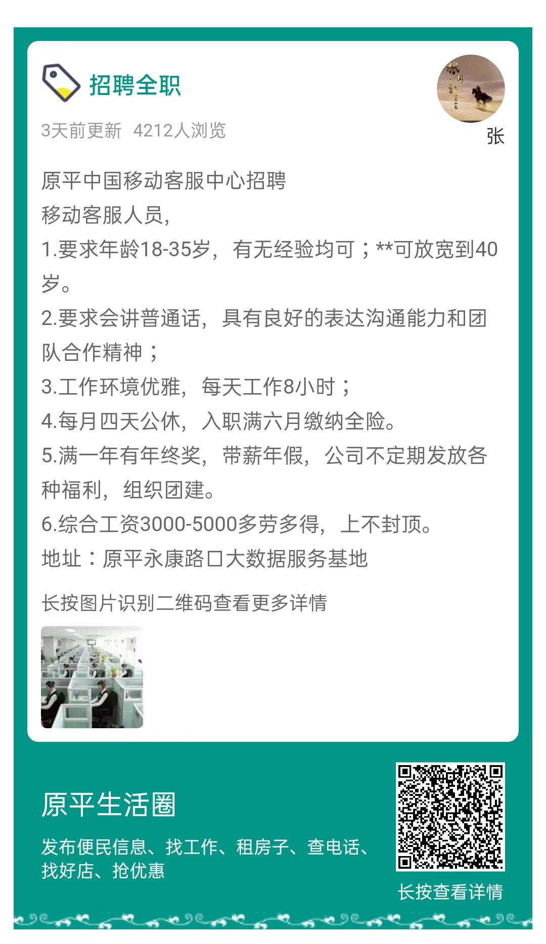 【最新招聘】原平中国移动客服中心招聘移动客服人员