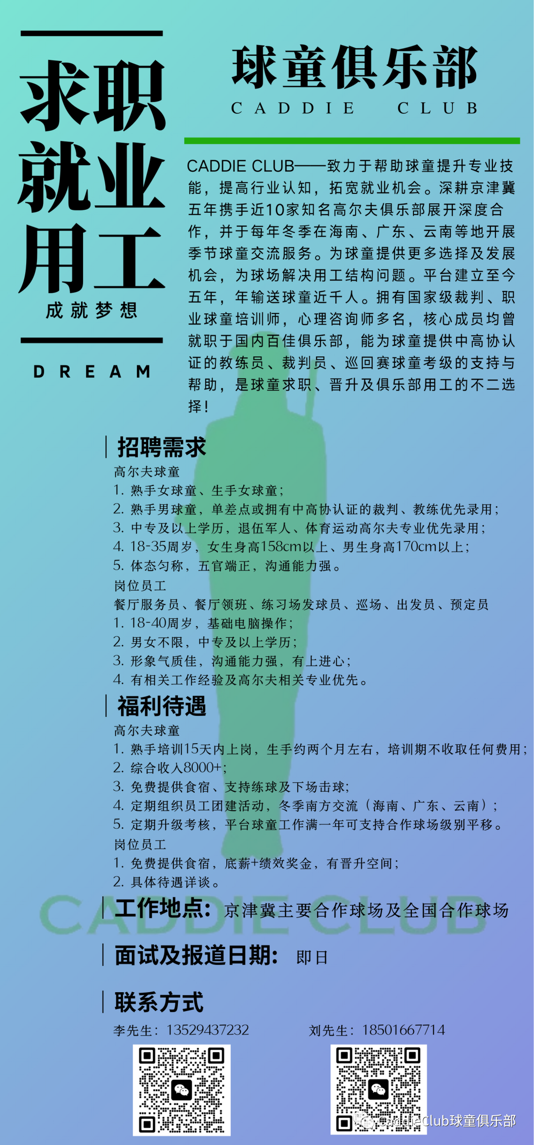 CADDIE CLUB专注于搭建全新的俱乐部球童管理与运营平台,为合作伙伴提供球童部门及运作部门托管、招聘、培训、劳务关系处理、劳动风险规避、成本控制、服务品质持续提高,追求模块化、标准化、统一集约高效的一站式服务。