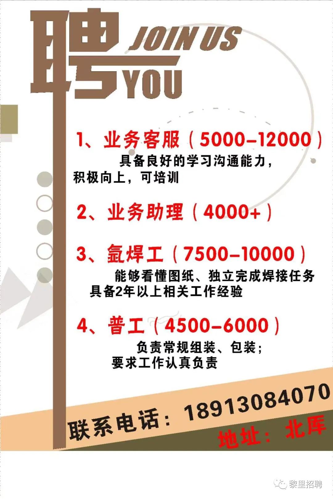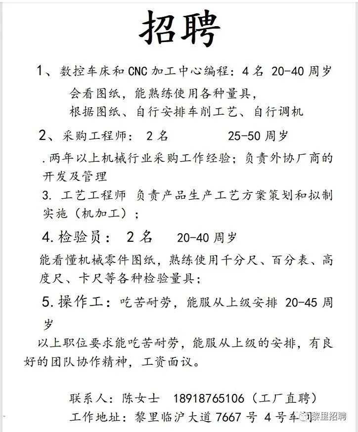 ![]() ![]() ![]() ![]() 【招聘】标识厂现招聘:1.导视焊接2名 2.组装熟练工2名 3.喷涂熟练工1名。4、锯边熟练工1名。厂址在七都,上下班都有大巴接送。工资面议,非诚勿扰。有意请致电:张18626203320 【招聘】办公室文员,20到38岁,会熟练使用办公软件,工资面谈,工作时间:每天8小时上六休一,包吃,工地作点:临沪大道,国光文化产业园 电话13160162000(陈总)微信同号 【招工】男45岁一55岁一名工作是剪板折弯工资面议,13646251309..地址:北厍厍厍南路603号 【招聘】苏州协和纸品有限公司诚招:普工10名(限男性)18-45岁。综合工资5000--7000。 仓库记货开单员一名,男女不限18-40岁。会简单电脑操作,综合工资5000--7000元。要求:有责任心,能吃苦耐劳,能配合加班!联系人:陈先生 电话:18361448698 地址:苏州吴江区汾湖经济开发区临沪大道1799号 【招工】地址金家坝。废铝打包,每天工作九个小时。中午管午餐。招50岁左右的常年男工!工资5000- 5500 联系电话13695829096 【招工】公司招聘: 激光工两名:25-35岁 激光学徒两名,22-35岁 普工6名,25-40岁 钣金工程技术一名,25-40岁 工资待遇面议,工作地址:北厍临沪大道6号,有意者请联系:15365363751 【招聘】精品打磨师傅2名,工资10000-~ ~13000。排版跟单电脑员数名8000——10000。组装6000——8000居角2名,工作地址上海松江区联系电话18602289879 【招工】仁拓标识工厂主营(3D打印字/霓虹灯字/)1、现招普工数名:年龄18—35岁、男女不限,有经验优先(4000—6000)学徒期第一个月:3500元 电话:13774347334 地址:吴江区北厍镇厍西路155号 【招聘】标识厂招工:①迷你字接线,会装灯接线,需要经验。②字牌组装工,会金属字组装,需要经验。③打磨工(粗打磨也可,需要标识厂打磨经验)地址:北厍大义路口,18913052333钱 【招聘】苏州吴江各镇区司机招募C1及以上驾照 配送对象:生鲜超市和便利店,各大仓库, 配送区域:无锡各区域,苏州,吴中,虎丘,木渎,昆山,吴江,同里,屯村,金家坝,芦墟,北厍,黎里,宛平,八坼,盛泽,南麻,震泽,庙港,七都,八都,梅堰,横扇,平望都有仓库, 月度工资:15000以上-多劳多得 配送车型1:绿色配送新能源货车, 配送品类:生鲜蔬菜水果,盒马,京东仓库,酒水饮料, 配送车型2:4.2米箱货车,包货源,一年20万,三年合同包60万,支持司机跟车体验, 欢迎自荐或推荐[强] 财富☎️ :赵经理13952419177(微信同号) 【急聘】直聘司机有C1或C1以上驾照证,身体健康,年龄25-55之间 2.吃苦耐劳,服从公司调度安排,工资多劳多得 3.退役军人,有实际驾龄经验优先,发展规划司机-车队长-调度-调度主管-运营经理 联系我时请说在百事通看到的,谢谢!☎️张主管:17311132055 【招聘】【涨价:友达光电派遣工周结220/天】男女不限18-38周岁 工期:第一个月220/天(周结) 每周五发上周所有工资 第二个月同工同酬: 底薪3300,加班基数2800 入职第3个月: 底薪3500,加班基数3000 另:夜补20元/天,技术加给:400元-1100元。 综合月收入:6500元-7500元每月5号发工资 招聘要求:男女不限,年龄18-38周岁 能接受轮班制,穿无尘衣,站立式作业! 相关福利措施: 1:提供入职免费体检 2:提供性价比较高的工作餐,种类多样(免费) 3:提供员工宿舍、无住宿押金(6人间,110元/人/月)、中央空调、独立卫生间、WIFI、洗衣机房 4:宿舍周边有大型生活广场、商场、超市、网吧、各种小吃店等一应俱全,生活便利 5:提供厂车(具体班次线路以公司实际情况为准) 报名电话:13671920584 【招聘】招聘美容师,美容师6名 学徒,不求才貌双全,只要踏实肯干,志同道合,做事认真。有责任心充满正能量年龄18 40岁之间,保底➕提成➕手工➕奖金 随便干2000 ~5000 努力干5000~10000 电话:18912744550 【招聘】标识厂招树脂字装灯封胶,简单雕刻,男女不限,大义路口丰江超市15370115488 【招聘】北厍博乐台球招聘收银,摆球,职业陪打等数名! 性别:女 年龄:18--35 要求:形象好,性格开朗,认真负责,无不良嗜好 待遇:底薪+提成 联系电话:15895482826 【招聘】景观雕塑公司工厂招聘: 一、电焊工打磨工等: 1、熟练操作电焊,亚弧焊,二保焊、磨光机等制作工具独立工作。 2、会制作标识标牌、雕雕等景观工程产品制作者优先。 3、不限性别,年轻人优先。工作认真负责,习惯良好,有良好职业操守。 工资待遇:面议。 工作地点:黎里,长白班。 联系方式:13962592746。 15290535591. 【招聘】蜂御堂中医诊所,招女推拿师,熟手优先考虑,收感兴趣能吃苦耐劳学徒。工资面谈!地址汾湖重庆路218号18962572933 【招聘】标识厂招聘以下人员: 1、业务员5名;底薪+提成,综合工资约3500-15000 2、超级字无边字制作师傅2名 综合工资约7500-9000 3、招氩弧焊工3 名;综合工资约7500-12000 4、精品打磨工 1名;综合工资约6500-10000 5、锯角师傅1名;综合工资6500-8500 上班八个半小时,做六休一 包吃包住,工作地址:上海宝山区 联系电话:13501886024田经理 2023年2月8日 【招聘男工】:1、流水线操作工; 2、品管部部长助理(不恐高);3、取样员(不恐高)五险一金,外地户口享受住宿补贴; 联系电话:0512-63207651 (请工作时间咨询8:00-17:00) 地址:苏州吴江金家坝金杨路3号 【招聘】招聘:办公室文员2名,熟练使用Office办公软件,懂CDR,Ai软件优先,男性组装工2名,有2年以上标识厂工作经验,联系电话:13676803783 【招聘】cnc数控操作员数名,需要有经验。 男:18—48岁, 薪资待遇 1:两班倒08:00—20:00 2:包食宿 3:22元/时。夜班补贴10元/班,综合薪资6500左右。 4:每月20号发工