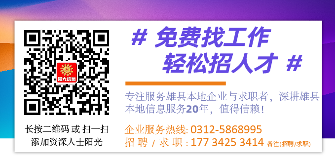 招聘 | 求职 | 宣传 | 找房源 | 请认准“雄县阳光信息部” 关注加★星标★ ![]()