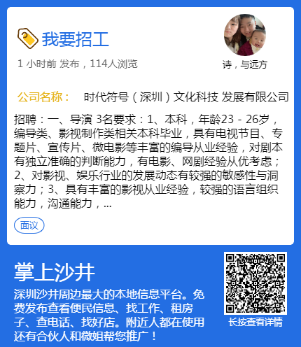 服务深圳沙井、新桥、松岗、福永周边地区300万人的社区综合信息门户网点击关注下方账号!!! 发布、查找、推送本地便民信息。 ☞ 深圳求职招聘群、租房群、二手闲置群、店铺转让群、外发兼职群