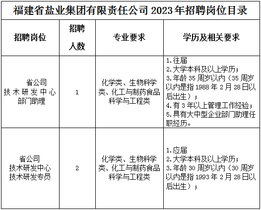 ?招聘单位:福建省盐业集团有限责任公司 ?需求人数:3人 ⌚报名截止:即日起至3月10日17:00 ?报名方式:网上报名 ?考核方式:考试采取笔试、面试、考察相结合的办法 ?联系电话:0591-87431839吴老师 ![]() 福建省盐业集团有限责任公司(以下简称“省盐业集团”)是福建省内依法从事食盐专营的国有大型企业,隶属于福建省轻纺(控股)有限责任公司,注册资本金5.08亿元;在全省9个设区市均设立全资盐业有限责任公司,拥有全资、控股、参股企业20家,从事盐相关产品的生产与销售,拥有3家国家食盐定点生产企业。公司坚决贯彻落实国家食盐专营政策,保障食盐供应,维护食盐市场稳定,努力实现国有企业的社会责任。公司立足于将“闽盐”品牌打造成中国食盐高端品牌,“闽盐”品牌系列产品原料生产均采用我省“原生态、纯天然、全人工”的传统独特古法晒制的制作工艺,不添加抗结剂,具有传统、天然、健康、美味的特点,是盐中珍品。主要经营:食盐、工业用盐、农牧渔业用盐、无机盐及盐化工产品和包装物、食品、轻纺产品的供应、批发零售,以及盐业生产技术服务与技术咨询。为深入贯彻落实省委人才工作领导小组有关会议精神,根据集团发展需要,拟公开向社会招聘3名人才充实相关岗位,现公告如下: 一、基本条件 1.招聘对象:具有国家承认的符合招聘岗位要求学历的毕业生;经原单位同意离职的各类在职人员。 2.招聘条件:具有中华人民共和国国籍,拥护中国共产党的领导,热爱社会主义,遵纪守法,品行端正,身心健康,具备招聘岗位所需的条件,符合公务员录用体检标准。 3.曾因犯罪受过刑事处罚的人员和曾被开除公职的人员,人民法院通过司法程序认定的失信被执行人,在各级公务员招考、事业单位及国有企业公开招聘考试中被认定有舞弊等严重违反录用(招聘)纪律行为的人员,现役军人,在读的非应届毕业生,以及有法律规定不得聘用的人员,不得报名。 4. 具备岗位所需的学历、专业、职业(执业)资格或技能条件等; (1)报考岗位要求的国内大学学历是指经教育部批准的具有普通高等教育招生资格的高等院校或科研院所、执行国家普通高等教育统一招生计划、通过国家统一招生考试录取的、按教学计划完成该学业,取得国家承认的学历文凭。 (2)国内院校与国外院校联合办学取得国内学历学位的,按国内院校毕业生报考,应由国内院校出具相应的证明。属国内院校与国外院校联合办学取得国外学历学位的,需出具国家教育部留学服务中心的《联合办学学历学位评估意见书》或《联合办学学历学位认证书》。 (3)留学回国人员、香港、澳门地区学习人员报考的,需提供国家教育部留学服务中心出具的《国外学历学位认证书》、《香港、澳门特别行政区学历学位认证书》或福建省人事行政部门出具的《留学回国人员身份认定审核表》、《港澳地区学习人员身份认定审核表》。 5.其他条件 (1)30周岁以内是指1993年2月28日以后出生、35周岁以内是指1988年2月28日以后出生、以此类推。 (2)工作经历计算方式:考生从工作开始时间至2023年2月28日的有效工作经验年限,在校期间的实习或社会实践经验不视为岗位要求的“相关工作经验”。 (3)招聘岗位要求的毕业证、学历(学位)证书须在2023年7月31日之前取得。针对毕业生岗位招聘的需要提供的学位证、毕业证和报到证须三证齐全。持境外学历学位证书报名者应提供教育部留学服务中心出具的学历学位认证书。如确有特殊情况的,经核实后可适当延迟到2023年7月31日。 (4)职称、职(执)业资格等各项资格认定证书必须在2023年7月31日前取得。因疫情影响,若已通过考试,但未取得证书者,须在面试前资格复核时,提供由相关部门出具的成绩单及是否通过考试的相关结论。 (5)招聘岗位的专业范围参照《根据福建省机关事业单位招考专业指导目录(2023年)》。 二、招聘岗位及要求