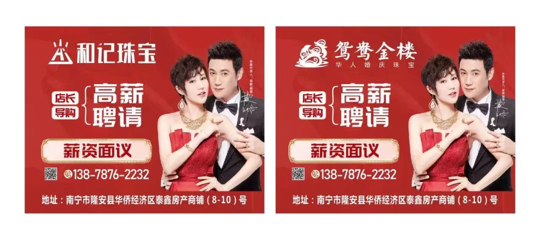 【招聘】 隆安那桐?和记珠宝&鸳鸯金楼? 诚聘优秀 珠宝顾问 数名 岗位要求: 1、热爱工作,努力认真积极; 2、有销售经验者优先; 3、年龄要求23—35岁。 福利待遇:月薪+月休+全勤+妆补+绩效奖金+任务奖金等福利; 联系方式:13878762232 罗生 联系时,请告之从【壮商网-原隆安网】看到的信息。