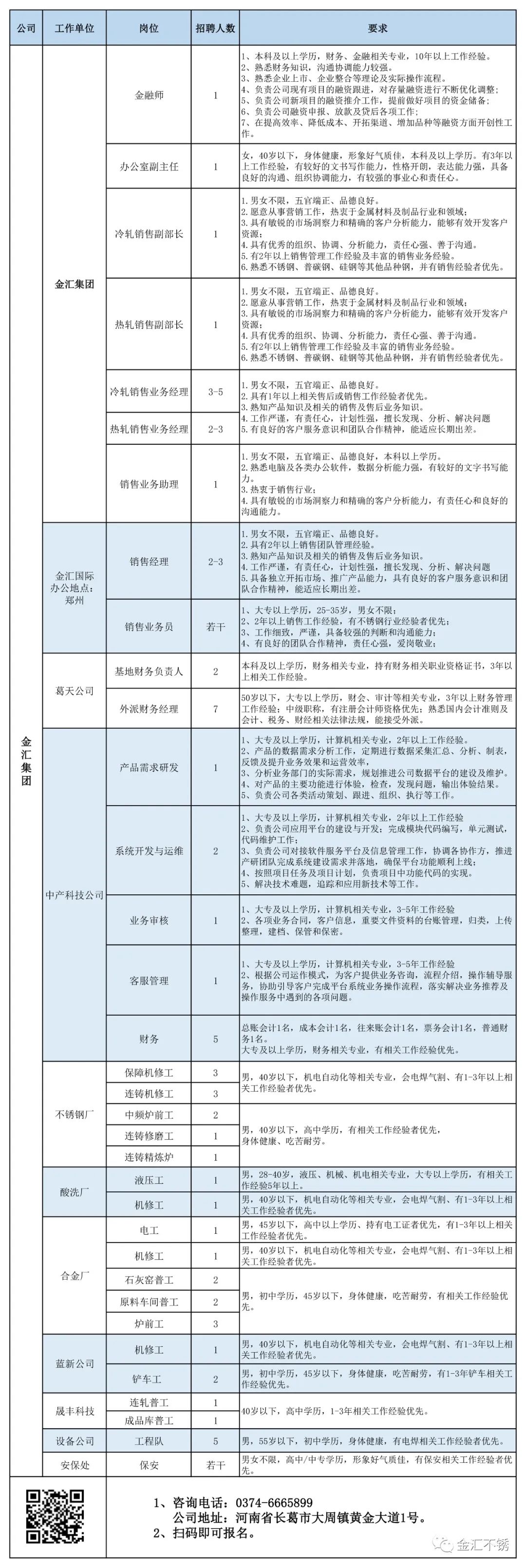 多年来,金汇产业集团依托大周镇“长江以北最大的有色金属集散地”优势,做强做大金汇产业,产业链条日益完善,科技水平逐步提升,现已形成城市矿产开发与利用、再生不锈钢生产、不锈钢制品加工制造、三产服务四大板块格局。现招聘岗位如下:
