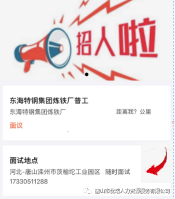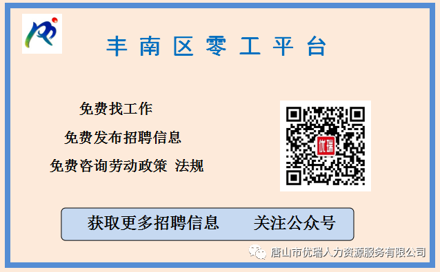 企业岗 正在招聘中...... 01事业单位招聘劳务外包 面试地点:丰南区事业单位 面试电话:17102779666(同微信) 1.厨师 厨师1名。 年龄20-58周岁,男性;炒菜好吃,不用有厨师证;具有良好的职业操守和个人品行,无违法违纪行为,身体健康,无不良嗜好。 【福利待遇】五险,双休、法定节假日 【薪资待遇】2950元 02唐山市丰南区从业人才服务中心 面试地点:丰南新城区 联系电话:17102779666(同微信) 1.人事专员 人事专员1名。 年龄:25-40周岁,全日制本科及以上学历。熟练掌握办公软件操作,有一定的文字组织和写作能力,有较强的沟通表达能力,有3年人事相关工作经验者优先。薪资2800-4500元 【福利待遇】 五险、双休、法定节假日 03丰南某车队 面试地点:丰南区 面试电话:18632520717 1.半挂车司机 数名,主跑丰南-胜芳大邱庄,两人一车,下车拿钱,库房装车,活计稳定,养老事多爱喝酒的请绕行。 【薪资待遇】一趟300二趟350 04纵横钢铁 面试地点:丰南开发区 面试电话:0315-8530055/8530005 1.驻矿业务员、细粉业务员、辅料业务员、废钢业务员 全日制大专及以上学历,应往届毕业生,有相关工作经验者优先。 【福利待遇】 五年一金、法定节假日、免费食宿、节日福利、工龄工资 05陆凯新材料(唐山市丰南区)有限公司 面试地点:丰南区经济开发区临港经济园创业街9号 面试电话:17731537959 1.车间主任 1名,男,30-45岁,大专以上学历,生产制造企业车间主任或生产调度岗位2年以上工作经验。 【薪资待遇】5000-8000 2.压胶工 2名,男,30-45岁,生产制造型企业1年以上工作经验。 【薪资待遇】4000-8000 3.操作普工 5名,男女不限,30-50岁。 【薪资待遇】4000-6000 4.维修钳工 2名,男,30-45岁,工业设备维修2年以上工作经验。 【薪资待遇】5000-8000 5.品保 1名,男,30-45岁,生产制造企业2年以上品保工作经验。 【薪资待遇】4000-5000 06河北东海特钢集团 河北东海特钢集团部分岗位已招满,提前咨询