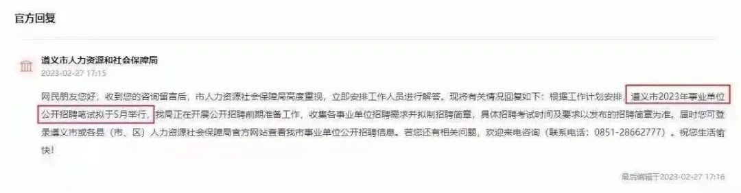 不管是湖北省还是云南省事业单位考试,都比往年提前了不少,而云南省也为考生们留下了充足的备考时间,对于没有发布公告的省份,小伙伴们是否悬着心在等公告呢?不必担心,暂时还没有发布公告的事业单位联考省份大概率与云南省一起参加联考,贵州的小伙伴们以5月7日笔试准备就好了!遵义市人社局官方回复:2023年事业单位公开招聘考试拟于5月举行。