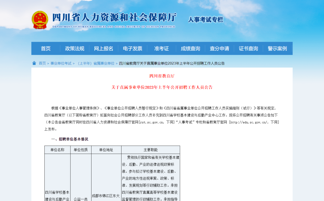 近日,四川省发布了事业单位2023年上半年公开招聘工作人员公告:
