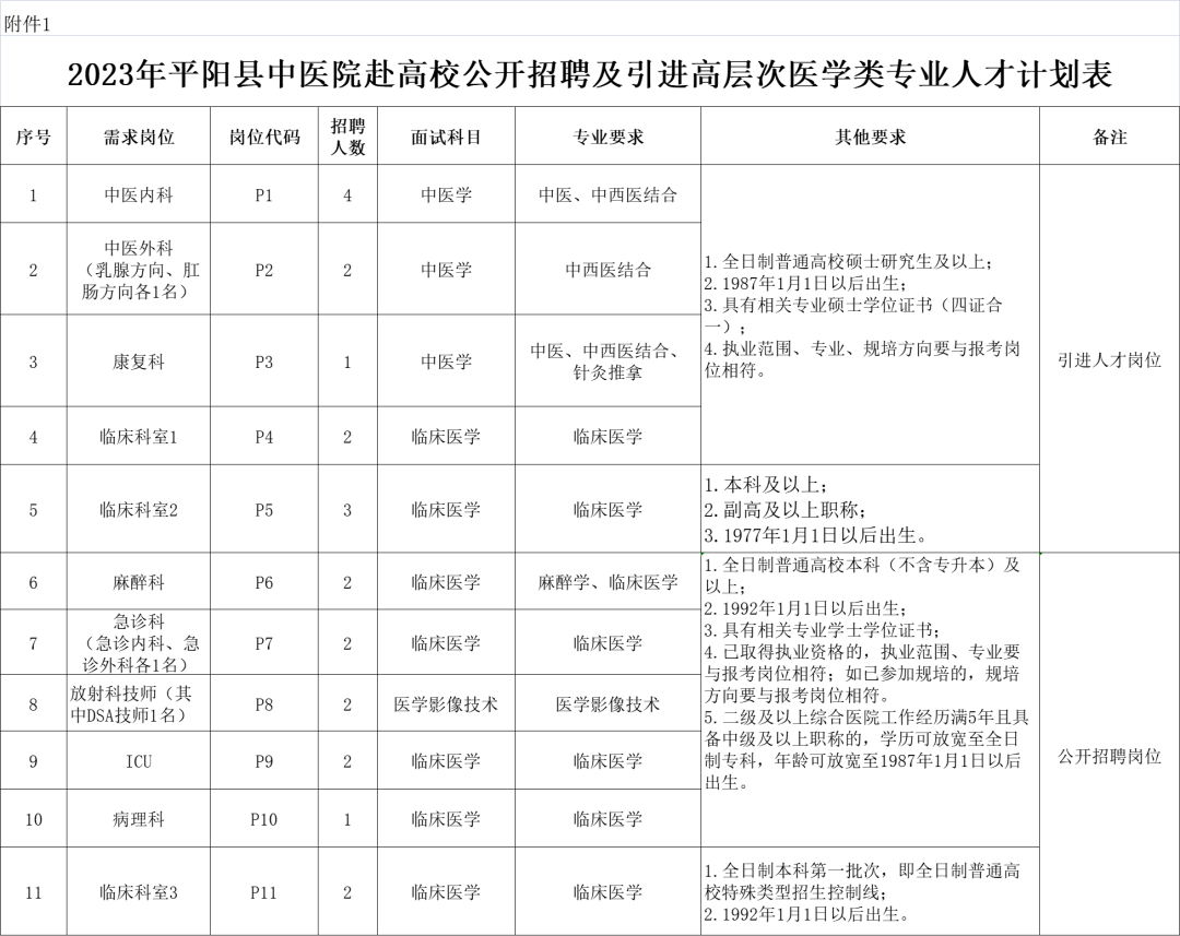 欢迎分享给身边的朋友 为进一步加强我院医疗卫生人才队伍建设,优化人才队伍结构,经县主管部门和人力社保部门审核,我院拟赴高校公开招聘及引进高层次医学类专业人才23名,现就有关事项公告如下: 一、招聘对象、条件及岗位 (一)拥护中国共产党的领导,遵守宪法和法律,热爱医疗卫生事业,品行端正,无不良行为记录; (二)具有适应岗位要求的身体条件; (三)具有医学类相关专业的基本素质和实践操作能力;符合岗位所需的学历、学位、专业、年龄、资格等相应要求。 (四)具体岗位及要求详见《2023年平阳县中医院赴高校公开招聘及引进高层次医学类专业人才计划表》(附件1)。