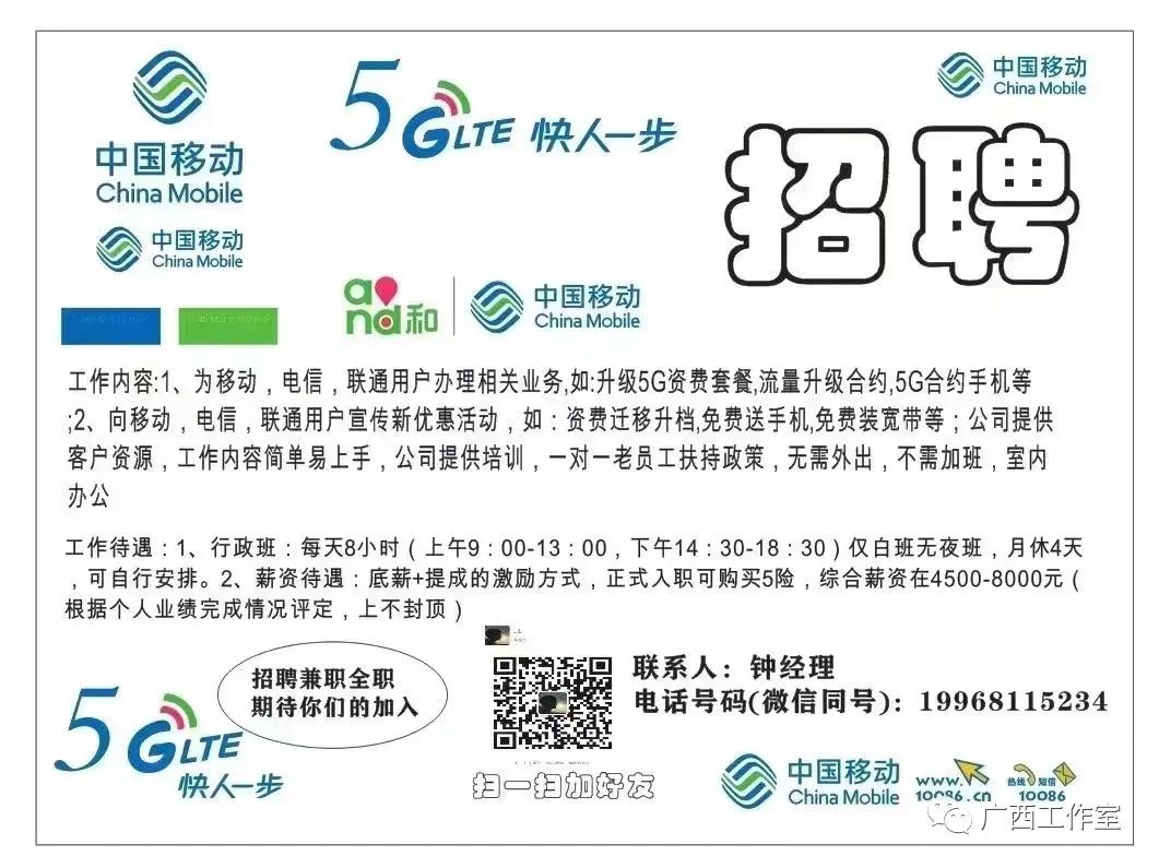 三连一下,获取每日精选招聘 声明 文中所有信息来源于网络,平台将尽可能避免不实信息,任何办卡、收费的请勿相信,工作室只负责信息发布,真伪求职者自行辨别,所有产生的风险及后果由求职者自行承担,与平台无关,求职者同意平台要求后再联系招聘方! 广西南宁兼职 运营不易,平台所发布内容如有侵权或失真,请及时联系我们删除信息,谢谢! 南宁瑞声招聘年后寒假工,临时工长期工 报销上来路费,2人以上组队送被子 约210元一天,每天安排入职入住,至少做7天以上周预支700元,包进 工作内容:组装手机喇叭 耳机 人员要求:18-40岁 工资待遇:19元/小时,包吃包住 上班时间:8-8点,中间休息一个小时 工作地址:江南区大国凯支道二路口 推荐人入职有奖500-1000块 联系方式:18377139576(微信同号) 应聘请备注应聘岗位+来源于广西工作室 文中所有信息来源于网络,平台将尽可能避免不实信息,任何办卡、收费的请勿相信! 南宁瑞声科技大量招聘技术工 设备技术员,主要工作内容是负责车间自动化设备日常调试,维修保养工作,工作轻松不累 任职要求:大专及以上学历,已取得毕业证,学信网可查,不限专业不限专业 上班时间:8:00-8:00,免费包吃住,买五险一金 年龄要求:18~40岁 综合薪资:7000-8500元/月 报名微信: 18377139576(微信同号) 应聘请备注应聘岗位+来源于广西工作室 文中所有信息来源于网络,平台将尽可能避免不实信息,任何办卡、收费的请勿相信! 季节在变,服务不变 天气在变,态度不变 选择一个好驾校,比努力更重要 永兴驾校学车报名活动 学车报名费:2080 一人报名优惠100 两人200以此类推 全新模式、全包班、可享受免刷学时、免站岗 无限学时、南宁41个场地任你选择 业务范围 A1、A2、A3、B1、B2 C1、C2、D、E大小车摩托车驾驶业务 欢迎随时实地考察驾校 校长电话:19107803140(微信同号) 应聘请备注应聘岗位+来源于广西工作室 文中所有信息来源于网络,平台将尽可能避免不实信息,任何办卡、收费的请勿相信! 南宁武鸣区伊利冰淇淋厂招聘(包车接送)临时工 至少做15天以上就行,人走账清 主要生产冰淇淋、雪糕,占据中国冷饮低 中、高端产品市场的主要份额 招聘条件:男女不限18-55周岁 两班倒,包装工工作轻松 工资待遇:包装工170~180块每天 工龄工资100-200元/月,月全勤奖100元 再加公司其它奖励 月综合工资5000-5500元左右,免费包吃住四人豪华宿舍,冬天暖气夏天空调,24小时热水(提供被褥) 工作地址:武鸣里建包装区 联系方式:18377139576(微信同号) 应聘请备注应聘岗位+来源于广西工作室 文中所有信息来源于网络,平台将尽可能避免不实信息,任何办卡、收费的请勿相信! 诚瑞光学今日正常招聘 员工工价19块/小时,包吃包住,仅限女工 年龄要求:18-40岁 招小时工、正式工 每月15号发上个月工资 男工正常17块/小时 工作地址:南宁江南区国凯二支路(大沙田附近) 联系方式:14795535303 应聘请备注应聘岗位+来源于广西工作室 文中所有信息来源于网络,平台将尽可能避免不实信息,任何办卡、收费的请勿相信! 明天玉洞跨境物流招聘打包工 平均时薪18-20块钱左右 员工福利:社保+提供吃住+长白班+包餐补 人员要求:18到40岁,男女不限,不用体检 男:上架,捡货,称重 女:打包,收件,签收 上班时间:8:30-20:30(中间休息1.5-2小时) 工资待遇:前面三天按17元/小时,第四天开始计件,时薪18-20块钱左右 综合薪资:4500-7000元/月,每月10号发薪 员工福利:买社保+每月250元餐补+提供住宿 工作地址:南宁良庆区银海大道保税区 备注:每天8:00-9:00安排面试入职,可当天上岗 联系方式:14795535303 应聘请备注应聘岗位+来源于广西工作室 文中所有信息来源于网络,平台将尽可能避免不实信息,任何办卡、收费的请勿相信! 东莞长白班厂 虎门诺誉电子长白班 21桥头厂+不体检(白班 21大岭山+不体检(两班 简介:手机屏幕检测,无尘服坐班全检QC岗位 招聘岗位:QC外观,全检 要求:16-40岁 班次:虎门诺誉|桥头厂区长白班 大岭山厂区两班倒,夜班补贴10元/晚 发薪:每月22号 伙食:厂区完全包吃住 住宿:4人间空调宿舍 上班:QC上班超级轻松,独立岗位不是流水线 加微信:18377139576 应聘请备注应聘岗位+来源于广西工作室 文中所有信息来源于网络,平台将尽可能避免不实信息,任何办卡、收费的请勿相信! 招聘(外呼话务员) 全职找我/兼职找我 薪资待遇:底薪+全勤+提成+月休息 上班时间:早上9:00-18:30,13:00-14:30休息 工作要求:负责广西区内外呼,主动向公司目标客户推荐宣传与回馈优惠活动 工作地址:南宁市青秀区中山府5栋二单元 人员要求:女生(20人) 有意向的可私聊(兼职全职都行) 报名方式:电话19968115234(微信同号) 应聘请备注应聘岗位+来源于广西工作室 文中所有信息来源于网络,平台将尽可能避免不实信息,任何办卡、收费的请勿相信! 急招薛之谦演唱会内场安保 工作时间:4月1日 工作要求:男身高165,女身高155 工作内容:维持演唱会现场秩序 工资待遇:100-130之间 注:需要办理安保证,我司即可办理 活动结束结算工资 报名微信:369429380 应聘请备注应聘岗位+来源于广西工作室 文中所有信息来源于网络,平台将尽可能避免不实信息,任何办卡、收费的请勿相信! 南宁站务员(可接受实习生) 招聘条件:学历要求中专 高中及以上学历,可接受实习生 年龄:18-28岁 身高:男生净身高168cm以上 女生净身高158cm以上 五官端正,身体健康,双眼裸视力为0.8以上 无纹身或