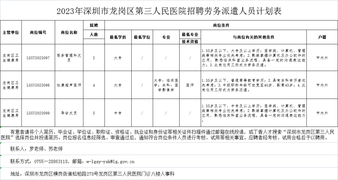 附件:2023年深圳市龙岗区第三人民医院招聘聘员及劳务派遣人员岗位表
