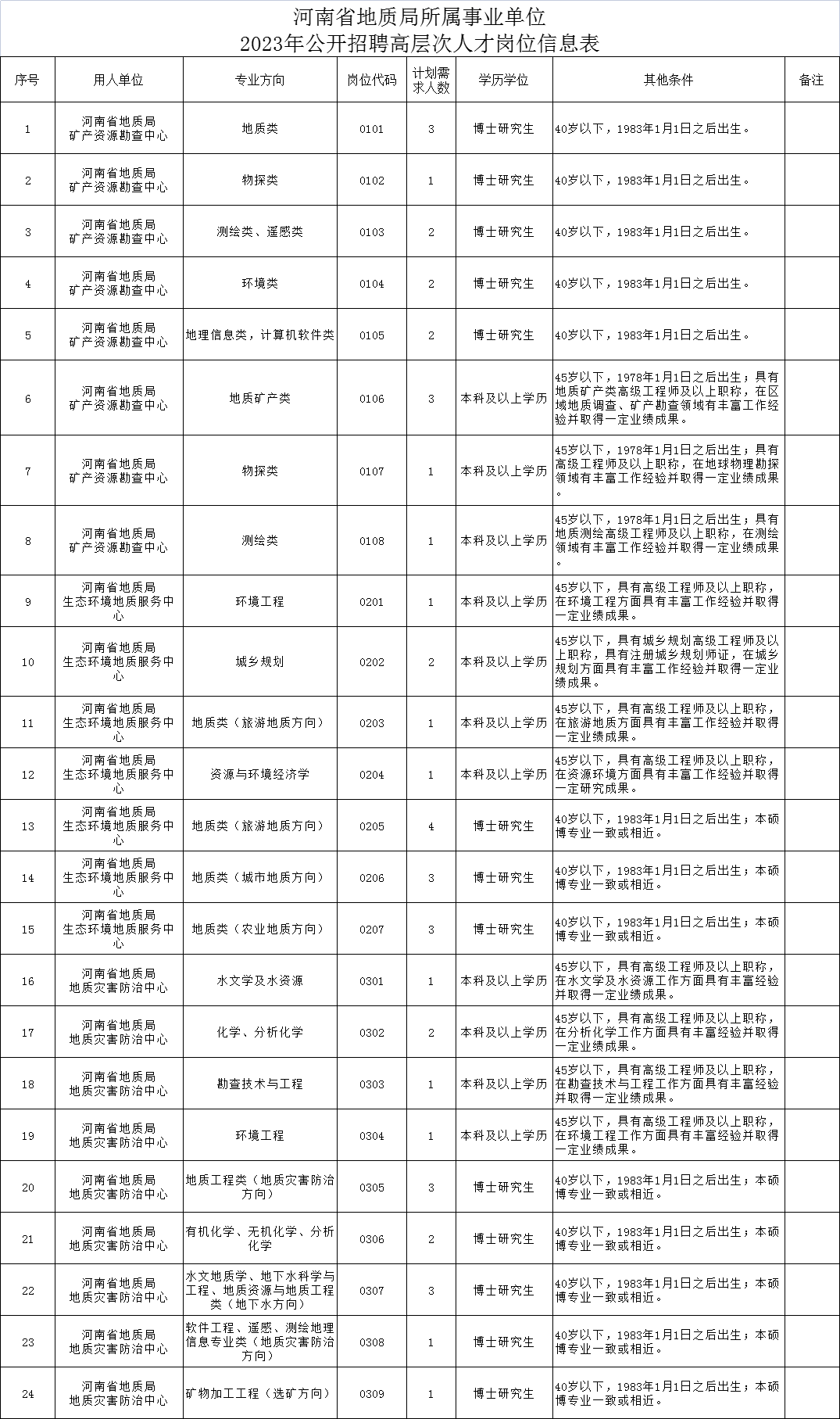 为加强我局高层次人才队伍建设,更好地为我省经济社会发展提供矿产资源调查、生态修复和地灾防治等公益服务,根据《河南省事业单位公开招聘工作规程》(豫人社〔2015〕55号)和《河南省事业单位招才引智“绿色通道”实施细则》等有关规定,结合我局人才队伍现状,我局所属矿产资源勘查中心、生态环境地质服务中心、地质灾害防治中心等3家事业单位拟面向社会考试引进45名高层次人才,具体实施方案如下: 一、招聘单位简介 1.河南省地质局矿产资源勘查中心是是河南省地质局直属公益一类事业单位,由原河南省航空物探遥感中心、河南省地矿局测绘地理信息院、河南省地矿信息中心组建而成。主要职责是承担国家和省公益性、战略性矿产勘查工作任务,具体承担规划编制、调查评价、勘查、勘探等技术工作;建设航空物探遥感、测绘地理信息等支撑矿产勘查工作的专业平台,为全省地质勘查行业、矿产资源高效综合利用提供技术支撑与服务。 2.河南省地质局生态环境地质服务中心是河南省地质局直属公益一类事业单位,由原河南省地质矿产勘查开发局第二地质环境调查院和河南省煤田地质局资源环境调查五院组建而成。中心主要职责是承担我省生态环境领域的公益性地质任务,打造环境地质调查和生态地质调查专业平台,开展自然资源综合调查与评价、地表基质调查和水资源调查评价等工作,为生态环境修复、城乡建设、国土空间规划、农业农村环境综合整治等服务。 3.河南省地质局地质灾害防治中心是河南省地质局直属公益一类事业单位,由原河南省地质矿产勘查开发局第一地质环境调查院和原河南省岩石矿物测试中心组建而成。主要职责是建设我省地质灾害防治专业化队伍和面向社会的公益性地质服务窗口,承担全省地质灾害调查评价、监测、预警预报、治理、应急处置等技术性工作任务,为全省市县地质灾害防治提供相关技术支撑与服务;承担岩石矿物测试等工作任务,开展面向社会的公益性地质服务。 二、招聘岗位数量、层次和专业要求 招聘数量共45名,其中博士研究生30名;高级工程师及以上职称专业技术人员15名。具体岗位专业详见附件1。 三、招聘对象及应聘条件 (一)应聘人员必须具备的基本条件: 1.具有中华人民共和国国籍; 2.拥护党的基本路线和方针政策,具有良好的政治素质和思想素质; 3.遵守国家法律法规,具有良好的道德品行; 4.已取得学历学位证书,具备履行岗位所需的专业知识和技能; 5.年龄为:博士研究生1983年1月1日以后出生;高级工程师及以上职称专业技术人员1978年1月1日以后出生。 6.适应岗位要求的身体条件。 (二)有下列情形之一的不得报名应聘: 1.刑事处罚期限未满或者涉嫌违法犯罪正在接受调查的人员; 2.尚未解除党纪、政纪处分或正在接受纪律审查的人员; 3.五年内曾在公务员招录、事业单位公开招聘考试中被认定有舞弊等严重违反招聘纪律行为的人员; 4.国家和我省另有规定不得应聘的人员。 四、招聘程序 本次公开招聘高层次人才按照发布公告、报名、资格审查、考试、体检、考察、公示等程序进行,择优聘用。 (一)方案发布 公开招聘高层次人才公告在“中国·河南招才引智创新发展大会”官网、河南省人力资源和社会保障厅和河南省地质局网站同时发布。 (二)报名 有意向到我局所属事业单位工作的高层次人才,请在附件2中下载并填写《河南省地质局所属事业单位2023年公开招聘高层次人才报名表》。电子邮件务必以“应聘岗位+姓名+学位+专业+毕业学校”(如:0101-张三-博士-水文地质学-中国地质大学)格式作为邮件主题和附件标题发送至附件3中的报名单位邮箱,报名材料包括: 1.《河南省地质局所属事业单位2023年公开招聘高层次人才报名表》(见附件2); 2.有效期内身份证扫描件(正反面); 3.本科以来的学历、学位证扫描件,境外获得学历学位者还须提供教育部留学服务中心出具的《国外学历学位认证书》); 4.能证明本人学术水平的代表性成果等有关材料扫描件或照片; 5.已参加工作的在职人员须提供单位同意报名证明。 6.报名起止时间:即日起至2023年9月29日,每天8:30-12:00,14:30-18:00。 (三)资格审查 资格审查由招聘单位负责。应聘者持填写完整的报名表(附件2《河南省地质局所属事业单位2023年公开招聘高层次人才报名表》)、1寸免冠照片2张(须与报名表上同底版)、身份证、各阶段毕业证及学位证、专业技术职务任职资格证等证件原件及复印件各1份(查验原件、留存复印件)到报名单位进行资格审查。 资格审查与地点另行通知。 根据资格审查情况,确定进入面试人员。资格审查贯穿公开招聘全过程,应聘人员必须保证其应聘材料的真实性,如弄虚作假,一经发现立即取消应聘资格,由此产生的一切后果由应聘人员个人承担。 (四)考试 本次公开招聘高层次人才采取面试考试方式确定拟聘人选,面试方法采取专业技术考试,由招聘单位具体组织实施。主要考试应聘者专业理论知识水平和实际应用能力、逻辑思维和应变能力、语言表达能力、以及科研水平等综合素质内容。面试全程录像,整场面试结束后现场公布面试成绩并及时在网上发布成绩排名。具体考试办法如下: 1.面试考试满分100分。由高分到低分依次进入体检人员名单。 2.若面试成绩并列的,进行加试,根据面试成绩高低,按1:1的比