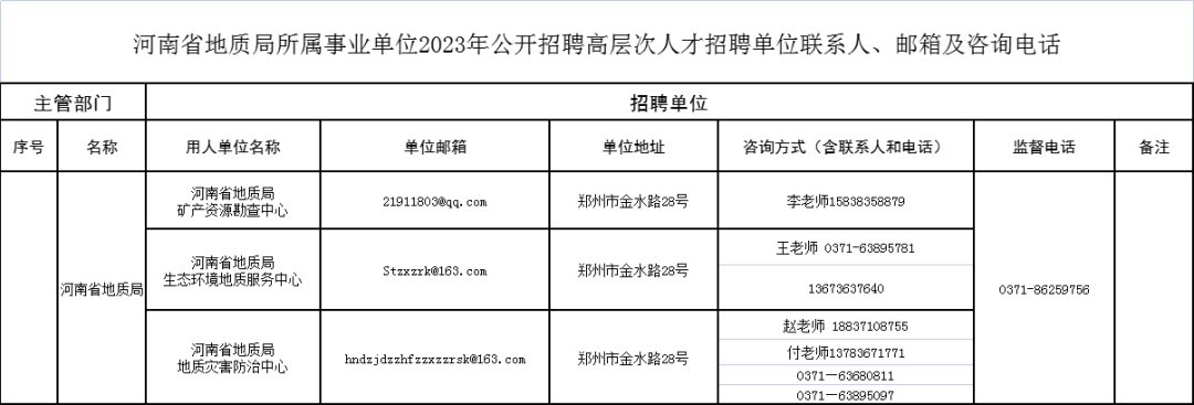3.《河南省地质局所属事业单位2023年公开招聘高层次人才招聘单位联系人、邮箱及咨询电话》