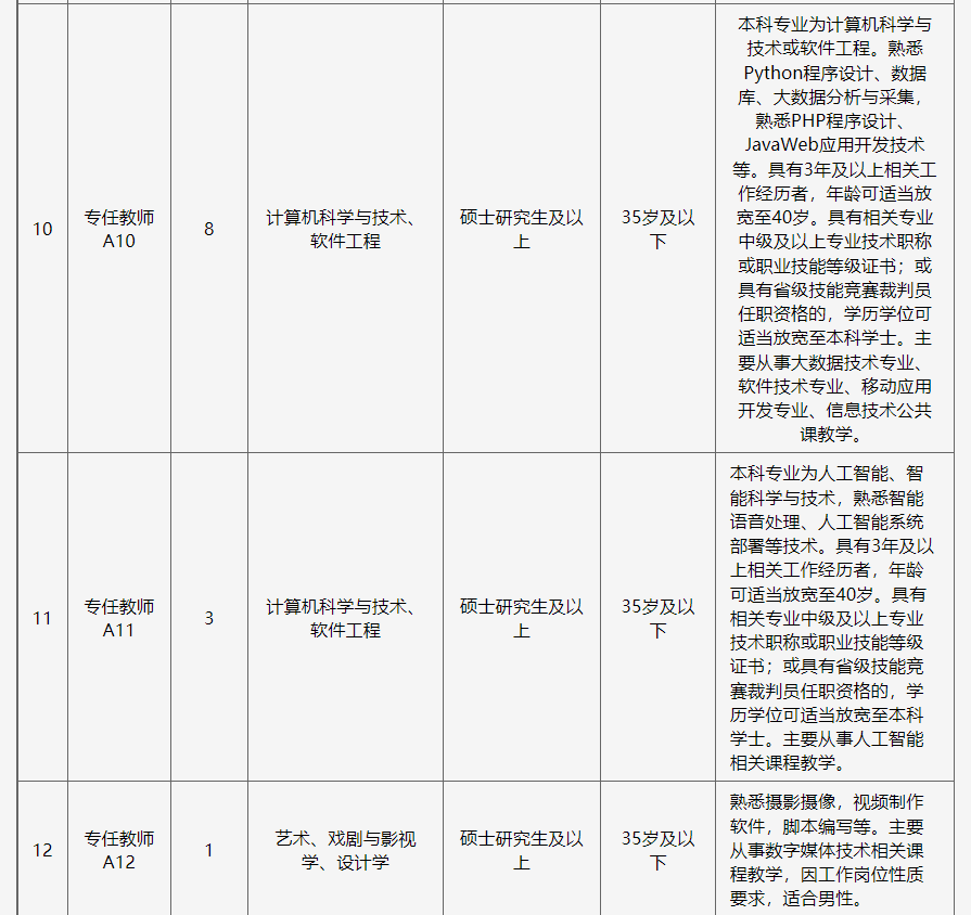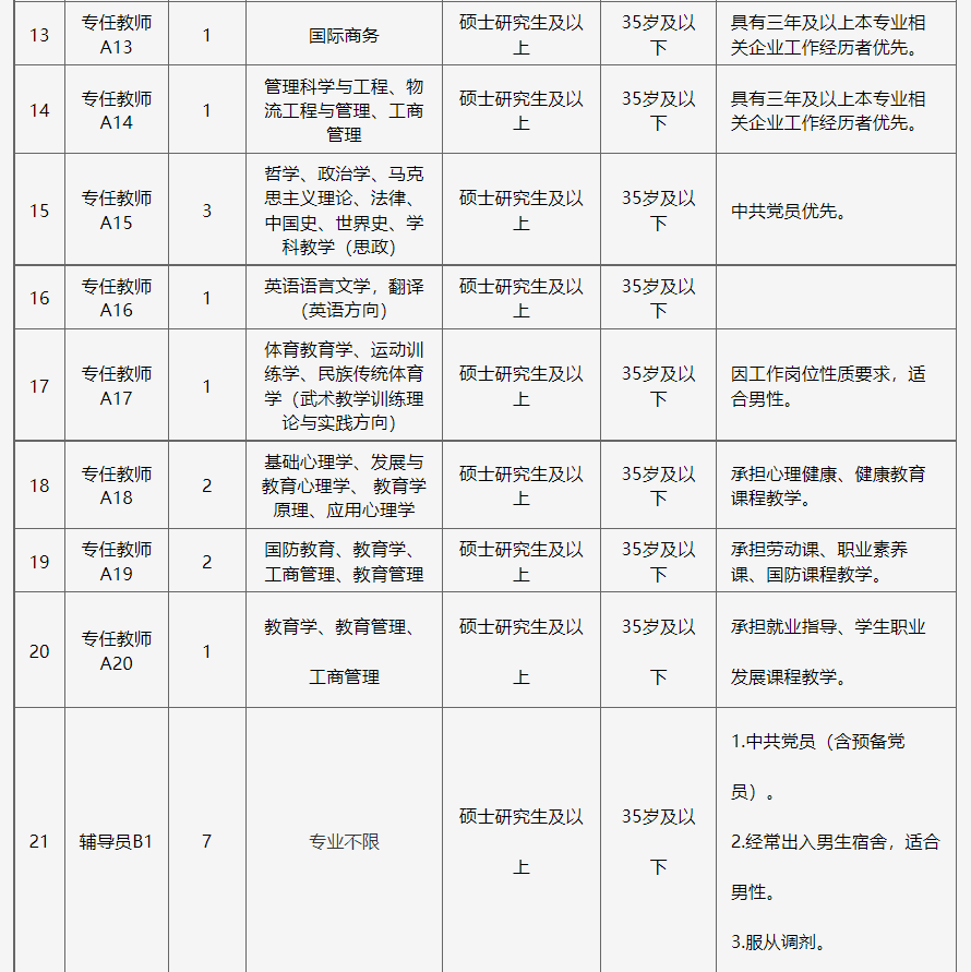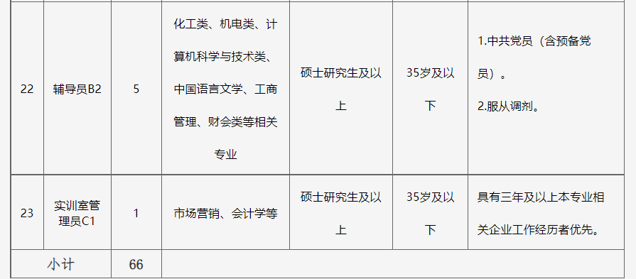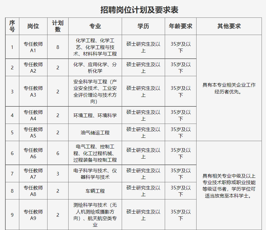 点击蓝字,关注我们 湖南石油化工职业技术学院 2023年下半年招聘非事业编制工作人员公告 一、学校简介 湖南石油化工职业技术学院是湖南省教育厅直属公办全日制普通高等学校,是中南地区唯一一所全面对接石油化工行业产业集群的公办高职院校。学校坐落于有着2500多年悠久历史的文化名城——岳阳,前身为1978年成立的湖南长岭石油学校,2003年升格为全日制普通高等职业技术学院,2013年10月成建制移交湖南省政府管理,2020年9月搬迁至岳阳市湘北大道大学园区。 学校设有石化工程学院、机电工程学院、经管信息学院、大数据与人工智能学院、马克思主义学院、人文学院、继续教育学院七个二级学院和科研与实训中心、学生职业发展中心、图书与信息资源中心三个服务和支持中心,形成了石油化工技术,化工装备技术,跨境电子商务,大数据技术4个专业群,开设20多个专业,建立了各专业大型稳定的校外和校企联合办学实习实训基地,拥有长江以南门类齐全、设施先进的“国家级应急救援安全演练基地”。学校目前占地面积约400亩,11万平方米校舍,教学科研仪器设备资产总值6000万元,36万余册藏书,380多名教工,在校学生规模8000人。 学校行业特色鲜明,办学优势突出,是教育部首批现代学徒制试点单位、中国石油和化学工业联合会理事单位、中国石油化工行业高素质技术技能型人才培养基地,多次被评为湖南省文明高校、湖南省大学生就业创业示范校。 学校坚持“人才强校”战略,拥有一支教学经验丰富、知识结构合理、爱岗敬业、奉献进取、科研能力强的“双师型”教师队伍,并且充分利用校企沟通平台,大力培养校内导师和企业导师两支队伍,打造“四能型”(即“既能当理论教师、又能当实训教师;既能当企业培训师、又能当工程师”)双师团队。以石油化工技术专业教学团队(省级专业教学团队)为代表在各种教学比赛和指导学生的技能比赛中脱颖而出,荣获省级以上大奖近百次。 为适应学校办学规模扩大和事业发展需要,现面向社会公开招聘一批合同制教师,现将具体招聘方案公告如下: 二、招聘原则 坚持德才兼备、以德为先的用人标准;坚持公开、平等、择优原则;坚持工作需要,人岗相适,注重综合能力和专业知识相结合。 三、招聘条件 (一)具有中华人民共和国国籍; (二)遵守中华人民共和国宪法和法律; (三)具有良好的品行和职业道德; (四)具有岗位所需的专业或资格条件,岗位所要求的专业; (五)适应岗位要求的身体条件及其他条件。 有下列情况之一者不受理报考: (1)受过刑事处罚的; (2)处于党纪、政纪处分期间的; (3)涉嫌违纪违法正在接受审查尚未作出结论的; (4)其他不宜报考的。 四、招聘岗位计划及要求 ![]() ![]() ![]() ![]() 备注:1.35岁及以下指1988年1月1日以后出生;40岁及以下指1983年1月1日以后出生。 2.岗位要求的工作经历年限按足年足月累计计算,以2023年8月31日为截止日期。 3.本次招聘所设专业不区分专业硕士和学术硕士。 五、招聘程序 (一)发布信息 招聘信息通过湖南石油化工职业技术学院官网(https://www.hnshzy.cn)、云校招等途径面向社会公开发布。 (二)报名 1.报名时间:2023年9月20日至10月7日24点止。 2.报名方式:采取邮箱报名的方式,每人限报一个岗位。 报名材料投递要求:请应聘者将报名材料扫描或拍照,以压缩包(其名称为“岗位名称+姓名”)形式发送至报名专用邮箱: 644299546@qq.com 3.报名需提交的材料: ①请应聘者登录湖南石油化工职业技术学院网站自行下载并如实填写《湖南石油化工职业技术学院招聘工作人员报名登记表》(签名处需手写签名)(详见附件)。 ②电子版本人有效身份证、学历学位证书原件、学信网教育部学历证书电子注册备案表,应届毕业生还须提供毕业生就业推荐表(需盖学校公章)。 ③对报考岗位有特殊要求的相关证明材料,如党员证明、工作经历证明、职业资格证明等。 ④获奖证书和相关业绩材料(没有的可不提供)。 (三)资格审查 学校根据招聘基本条件和应聘岗位要求对应聘者进行资格审查,材料真实且符合招聘条件者列为考核对象。 (四)考核 1.考核方式 A1-A20岗位采用“试教+面试”方式考核。主要测评应聘者的专业知识、应变能力、课堂控制力等,按百分制折算成综合成绩,其中试教占综合成绩的60%,面试占综合成绩的40%。 B1-B2、C1岗位采用半结构化面试+实操方式考核,主要测评应聘人员的思想政治素质、思维能力、分析与解决问题能力、综合素质以及与应聘岗位的专业能力,按百分制折算成综合成绩,其中面试占综合成绩的60%,实操占综合成绩的40%。 所有岗位均设置综合成绩合格分数线70分(含70分),未达到合格分数线的,不再进入下一环节。 2.考核时间和地点另行通知。 (五)体检 根据公务员体检项目要求进行,并将体检报告递交学校,合格者进入公示环节。 (六)公示 根据综合成绩、体检结果,经学校审议确定拟录用人员,审查合格的拟录用人员名单在湖南石油化工职业技术学院网站公示3个工作日。 学校纪检监察部门全程监督与受理招聘问题反映。 六、录用及待遇 经公示无异议后,办理录用手续,签订劳动合同。 七、联系方式 咨询电话:0730-3066067 15907300781 张老师 地 址:湖南省岳阳市湘北大道 八、其他 (一)请应聘人员确保联系方式正确、畅通。因无法与应聘人员取得联系所造成的后果,由应