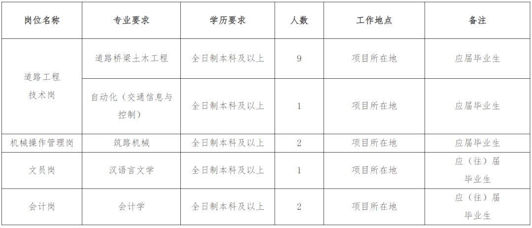 河南中州路桥建设有限公司根据公司发展需要,经研究决定面向社会公开招聘15名工作人员。 河南中州路桥建设有限公司(以下简称“公司”)创建于1965年,2005年根据国家政策,经市政府批准,由事业单位改制为市属国有企业,同年更名为河南中州路桥建设有限公司。公司注册资本金10亿元,河南省公路建设行业信誉信用评价AA级。具有公路工程总承包壹级资质,公路路面工程专业承包壹级;公路路基工程专业承包壹级;桥梁工程专业承包贰级;公路交通工程(公路安全设施分项)专业承包贰级;市政公用工程施工总承包贰级;建筑工程施工总承包贰级;路基路面养护甲级;桥梁养护甲级;隧道养护乙级;交通安全设施养护资质。主要经营范围为建设工程施工;公路管理与养护;房地产开发经营;检验检测服务;建设工程质量检测;土石方工程施工;交通设施维修;废旧沥青再生技术研发;水泥制品制造;建筑材料销售;砼结构构件制造;建筑工程机械与设备租赁;公路水运工程试验检测服务;新材料技术研发。是河南省本行业中的领先企业,周口市规模最大、实力最强、最具影响力的国有企业。 坚持人员素质与岗位要求相匹配原则;坚持公开、公平、公正的原则;坚持任人唯贤、德才兼备的原则。1.有中华人民共和国国籍,拥护中华人民共和国宪法,拥护中国共产党的领导和社会主义制度;4.能够积极践行公司企业文化和价值观,事业心和责任感强,具有较强的团队精神;5.此次招聘全部为施工一线岗位,符合企业施工一线岗位要求,身体健康,组织能力、协调能力强,能够吃苦耐劳,服从公司安排,聘用后全部到施工一线试用锻炼。6.具有一定的工程建设相关工作经验,持有专业证书者、优秀毕业生优先录用;7.报名资格要求:符合岗位要求的全日制本科及以上学历学位的应(往)届毕业生(含2022、2023年毕业的应届毕业生);第一学历主修:道路桥梁、土木工程、自动化(交通信息与控制)、筑路机械、汉语言文学、会计学;年龄35周岁以下,出生日期在1988年8月30日之后;年龄计算时间截止到2023年8月30日。毕业证、学位证在中国高等教育学生信息网(http://www.chsi.com.cn)可查。 5.曾在招聘考试中被认定有舞弊等严重违反招聘纪律行为的人员;招聘工作按照发布公告、网上报名、资格审查、笔试、面试、背景调查、体检、公示、聘用等程序进行。在周口市财政局官网(http://czj.zhoukou.gov.cn/)、黄河人才网(www.huanghehr.com),周口市人才集团微信公众号发布公告。重要提示:周口市财政局官网,周口市人才集团微信公众号为本次招聘工作专用网站,招聘信息、公告等有关事项,均通过该网站进行。请应聘人员随时关注,若本人不及时阅读相关信息,造成的后果,责任自负。(1)网上报名时间:2023年9月20日至2023年9月24日18:00,逾期不再受理。(2)报名方式:报名人员在周口市财政局官网(http://czj.zhoukou.gov.cn/)、黄河人才网(www.huanghehr.com),周口市人才集团微信公众号搜索“河南中州路桥建设有限公司2023年度招聘公告”下载并填写附件《河南中州路桥建设有限公司2023年度招聘报名表》,并在规定的时间内将毕业证、学位证、职称、职(执)业资格证等相关资料扫描压缩打包发送至邮箱zkrcjt@163.com,文件请统一命名“应聘岗位+姓名”命名,网上报名时提交下列材料:②毕业证、学位证和验证报告(2022年、2023年应届毕业生提交成绩单、获奖证书、就业推荐表);③各学历阶段《教育部学历证书电子注册备案表》和认证报告;④技术职称证、职(执)业资格证及复印件和认证报告;⑤任职要求所需的其他相关证明材料,反映本人能力水平和工作业绩的情况介绍及相关有效证明佐证材料;⑦提交《河南中州路桥建设有限公司2023年度招聘报名表》,请提前下载并填写完整。考生必须及时、准确、全面地填报信息和发送材料。在规定时限内,报名信息和材料不全的,考生应按要求补充完善报名信息和材料,因考生原因导致报名不成功的,责任自负。对报名人员按照招聘要求进行资格审查,资格审查合格人员公告在周口市人才集团微信公众号上公布。笔试、面试综合成绩实行百分制,其中笔试和面试具体时间、地点另行通知。请考生及时关注周口市人才集团微信公众号。根据面试成绩,按照1:1的比例从高分到低分确定为拟考察对象,并对考察对象组织开展背景调查,考察环节主要考察其思想政治表现、遵纪守法、道德品质、业务能力、工作实绩、心理素质、岗位匹配度等情况,如有考察不合格者或放弃资格者,则按应聘面试成绩排名高低确定等额递补人选。根据招聘岗位计划,按该岗位考试成绩从高分到低分1:1的比例确定体检对象。体检标准参照《公务员录用体检通用标准(试行)》和相关规定实施。体检时间地点另行通知,其费用由体检对象承担。放弃体检者或体检不合格者,取消录用资格,出现的缺额从应聘人员中按照综合成绩从高分到低分依次等额递补。拟录用人员名单通过周口市财政局官网、周口市人才集团公众号公示,公示期为5个工作日。公示期间有异议的,经查实影响录用的,取消录用资格,出现的缺额,从应聘人员中按照综合成绩从高分到低分依次等额递补。公示期满后,无异议的拟任人选,按照有关规定办理录用手续。聘用人员与河南中州路桥建设有限公司签订合同,试用期6个月,试用期满后由用人单位进行综合考核,考核合格的,予以正式