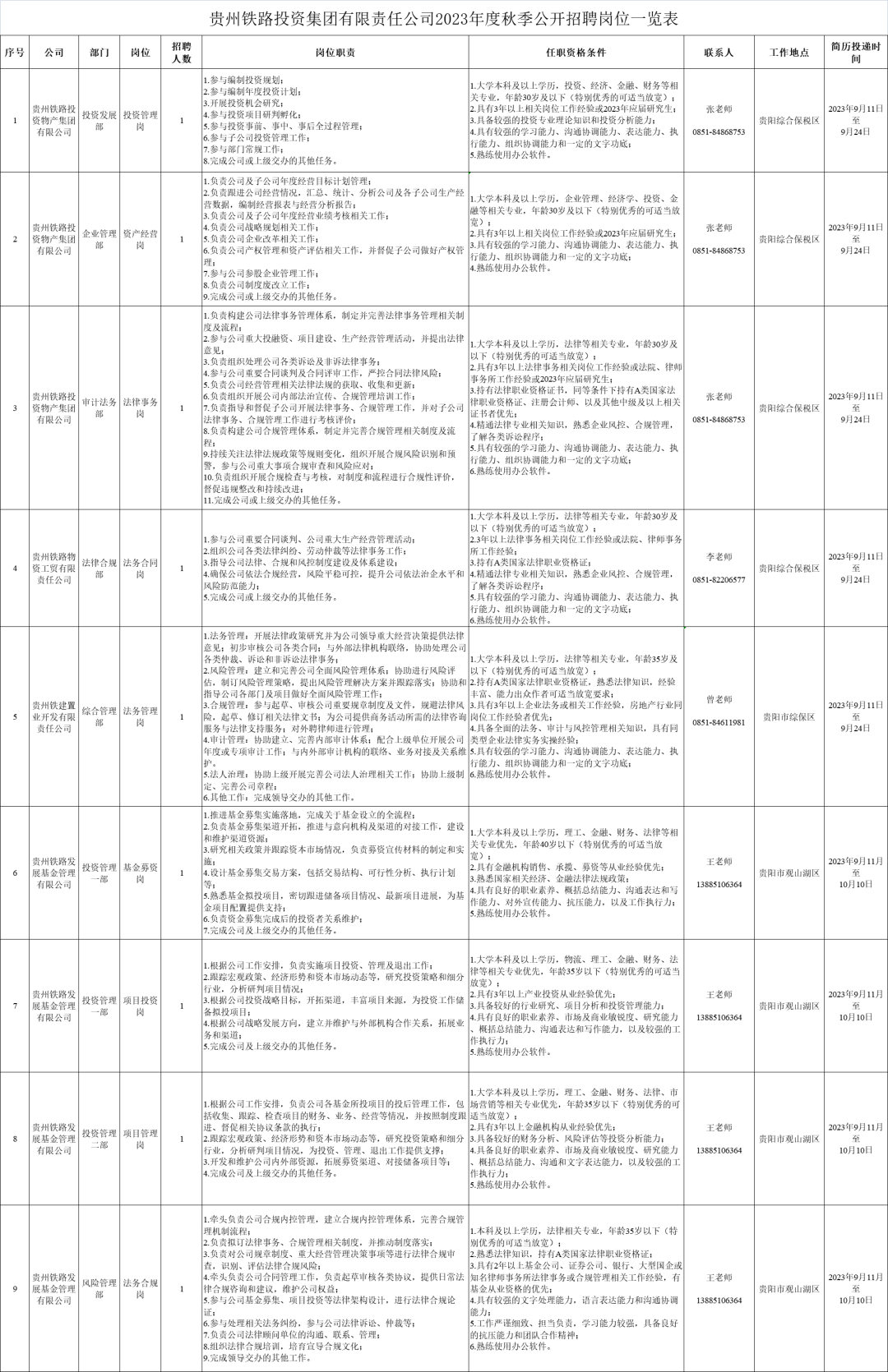 ![]() 一、公司简介 贵州铁路投资集团有限责任公司(简称贵州铁投集团),是经贵州省人民政府批准于2008年注册成立的省属国有大型企业,代表贵州省履行铁路建设出资人职责和合资铁路投资主体责任,承担贵州省地方城际铁路、资源性铁路、支线铁路等项目的投资、融资、建设和运营等任务。 目前,集团系统共有控股二级公司8家,分别为:贵州铁路投资物产集团有限公司、贵州铁投都拉物流有限公司、贵州铜玉铁路有限责任公司、贵州安六铁路有限责任公司、叙毕铁路贵州有限责任公司、贵州铁路发展基金管理有限公司、贵州铁建置业开发有限责任公司、贵州省多式联运产业发展有限公司。控股三级公司7家。 贵州铁投集团以“铁路建设和经营产业双轮驱动,实业经营与资本经营两翼齐飞”的发展战略,围绕铁路建设运营布局铁路综合物流、铁路建设物资和铁路沿线土地综合开发三大产业。公司成立以来,先后参与投资建设铁路项目21个。当前,集团以铁投物流、铁投物业、铁投物资、铁投基金为基础的实体产业发展格局基本形成。 为适应贵州铁投集团高质量发展需要,特面向社会进行公开招聘。具体内容见下: 二、招聘原则和程序 (一)招聘原则 1.坚持公平、公开、竞争、择优的原则; 2.坚持尊重知识、尊重人才、学以致用、专业对口的原则; 3.坚持统一报名、分级组织、分级考试、分级录用,分级开展招聘工作的原则; 4.坚持在集团公司党委领导下,各子公司党组织、集团公司党委组织部履行相应职责并接受社会和有关部门监督的原则。 (二)招聘程序 招聘程序按照编制招聘计划、发布招聘公告、报名及资格审查、笔试、面试、考察、体检、录用程序等进行。考试及录取通知等将通过电话、电子邮件或短信等方式告知。 三、招聘对象条件 (一)具有中华人民共和国国籍,拥护中华人民共和国宪法,具有良好的思想政治素质; (二)拥护中国共产党领导,拥护社会主义、具有正确的政治立场、政治态度、理想信念和思想品德; (三)遵纪守法,诚实守信,品行端正,人格健全; (四)有较强的事业心、责任感和团队合作精神; (五)具有胜任应聘岗位需要的相关专业知识和工作能力; (六)身体健康,符合应聘岗位要求的身体条件; (七)符合应聘岗位要求的其它具体资格和条件。 (八)有下列情形之一者不得报名: 1.不能坚持党的基本路线,在重大政治问题上不能与党中央保持一致的人员,有过反党反社会言行的; 2.定向到具体行业或单位的应届毕业生; 3.有过犯罪记录并受到判刑、处罚、惩戒、行政拘留的; 4.受到党内严重警告、行政记大过等处分尚在处分期或影响期内; 5.正在接受立案审查的或尚未给予结论的; 6.近三年在工作单位年度考核中曾被确定为“不称职”、“不合格”的人员; 7.不符合招聘岗位所需资格或条件的人员; 8.在国家和法定机构组织的各类招考中被认定有舞弊等严重违反聘用纪律行为的人员; 9.失信人员; 10.国家相关法律、法规规定不得招聘录用的其它情形。 四、招聘岗位及任职资格条件 详见附件。