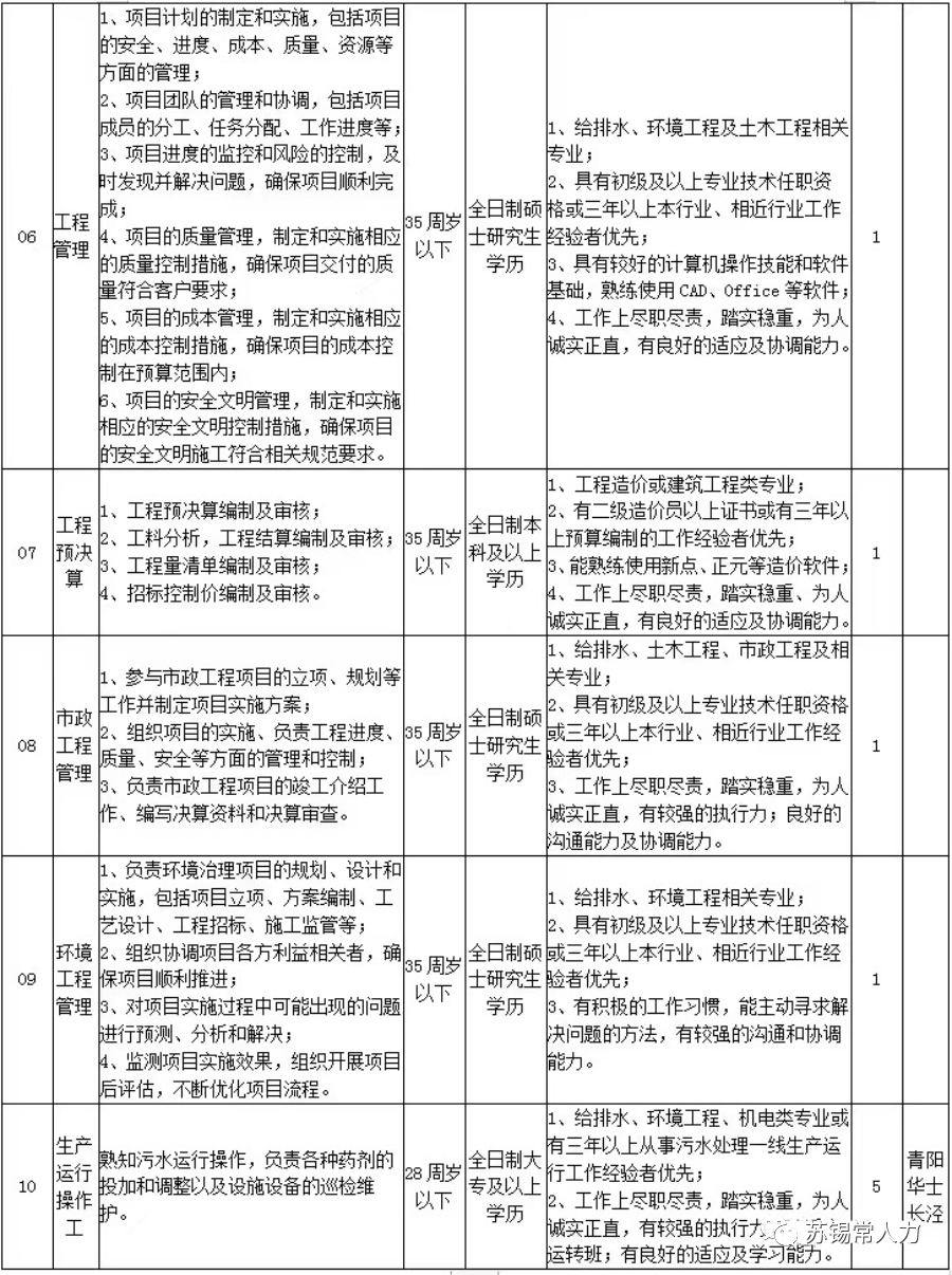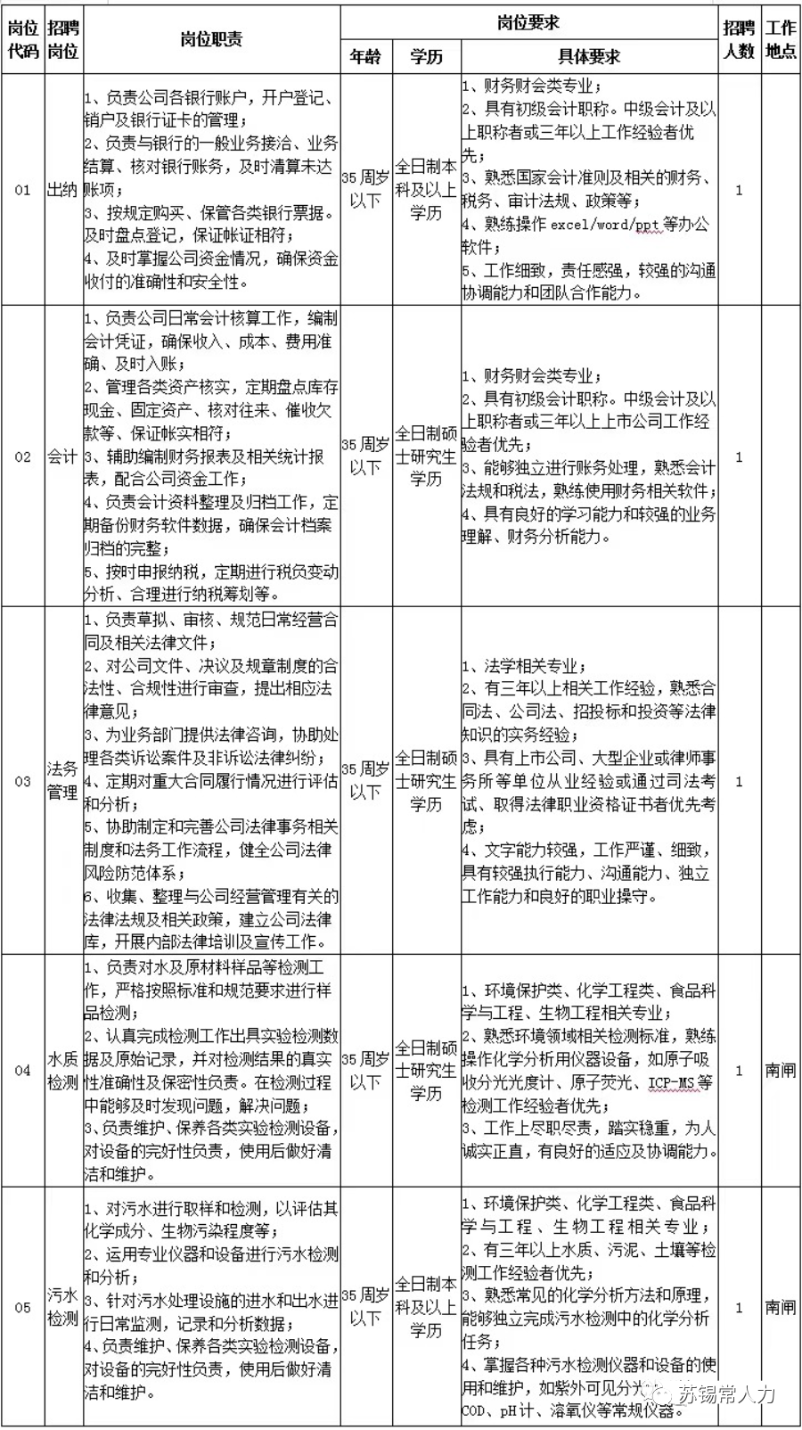 江阴市恒通排水设施管理有限公司是江苏江南水务股份有限公司的全资子公司,主要提供排水管网和泵站的管理、建设、维护和疏通服务;污水处理相关设施的经营管理;提供污水处理服务;工业净水加工等业务。因公司业务发展需求,按照相关政策规定,现面向社会公开招聘工作人员14名,现将有关事项公告如下: