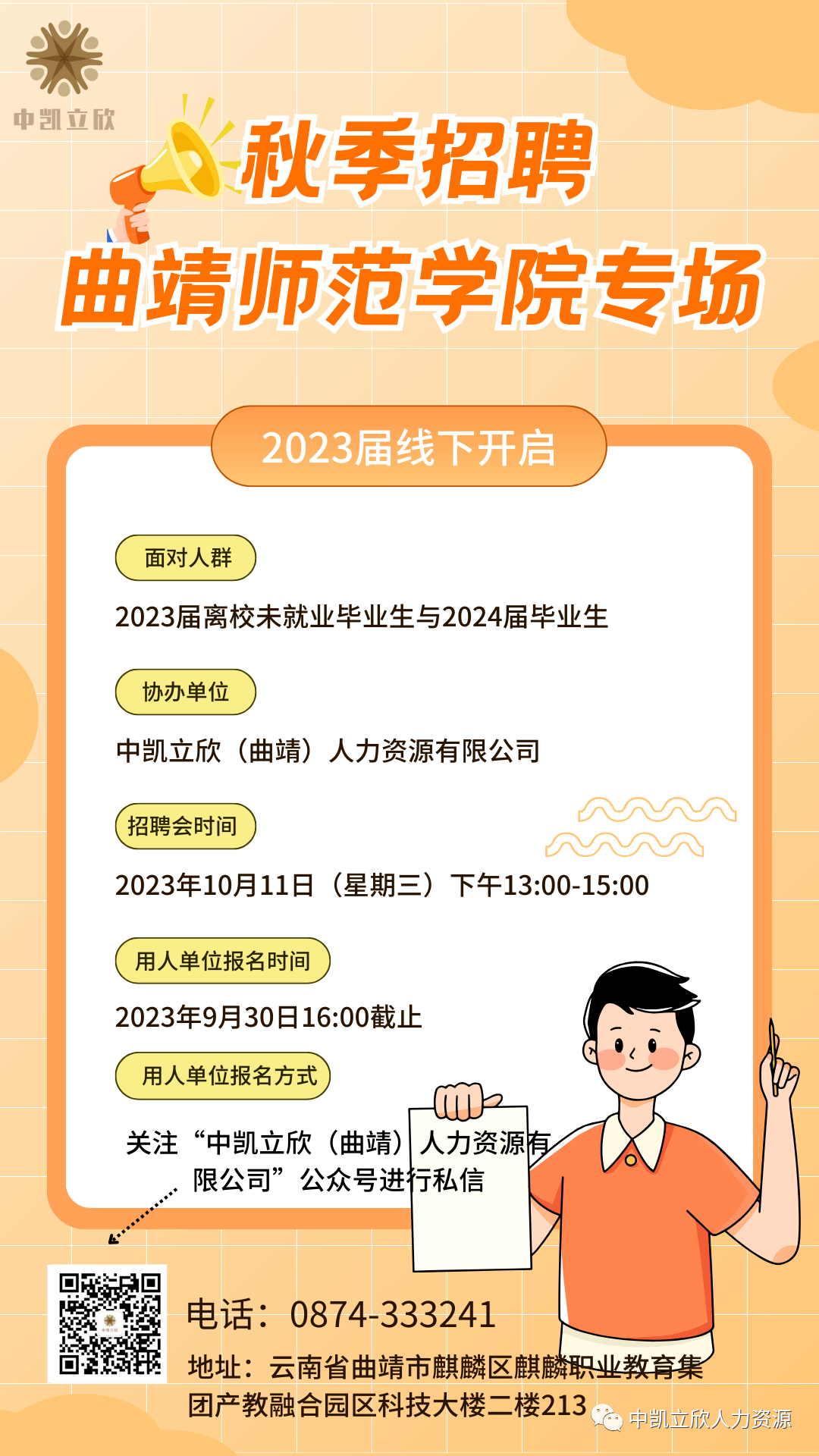 曲靖师范学院 2023 届离校未就业毕业生与 2024 届毕业生招聘会暨“智汇台州·百校引才”专场招聘会 邀请函 尊敬的用人单位: 衷心感谢长期以来对我校毕业生就业工作的大力支持!为贯彻党中央、国务院关于“稳就业”“保就业”工作重要决策部署,持续做好 2023 届离校未就业毕业生工作,积极推进 2024 届毕业生就业工作,同时为用人单位与毕业生提便捷、高效的对接服务,促进毕业生更充分和更高质量就业。特举办“曲靖师范学院 2023 届离校未就业毕业生与 2024 届毕业生招聘会暨“智汇台州·百校引才”曲靖师范学院专场招聘会”。 现将有关事项函告如下: 一、组织机构 指导单位 云南省教育厅 云南省人力资源和社会保障厅 主办单位 中共台州市委人才办办公室 台州市人力资源和社会保障局 曲靖师范学院 曲靖市人力资源和社会保障局 全国高校毕业生就业能力培训曲靖师范学院基地 承办单位 中共三门县委人才办公室 三门县人力资源和社会保障局 曲靖师范学院大学生就业创业服务中心 协办单位 中凯立欣(曲靖)人力资源有限公司 曲靖师范学院大学生就业指导协会 二、招聘会时间 2023 年 10 月 11 日(星期三)13:00—15:00 三、用人单位报名时间 即日至 9 月 30 日 16:00 截止 四、报名方式