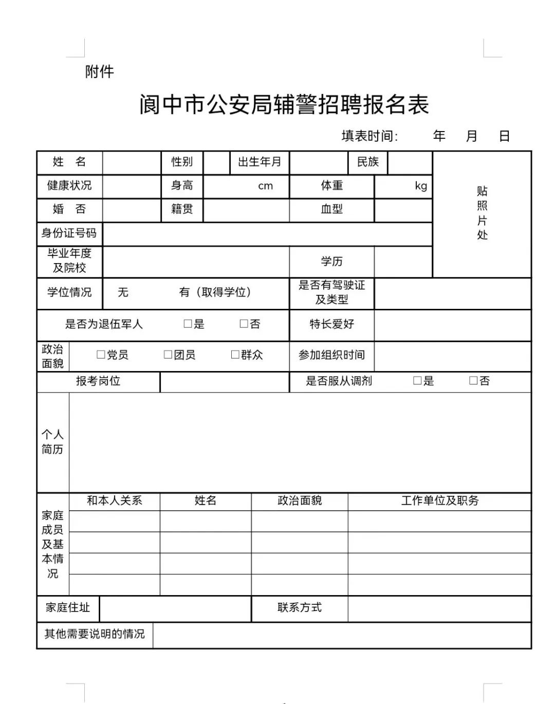 (1)事先填写好《阆中市公安局辅警招聘报名表》(见附件);