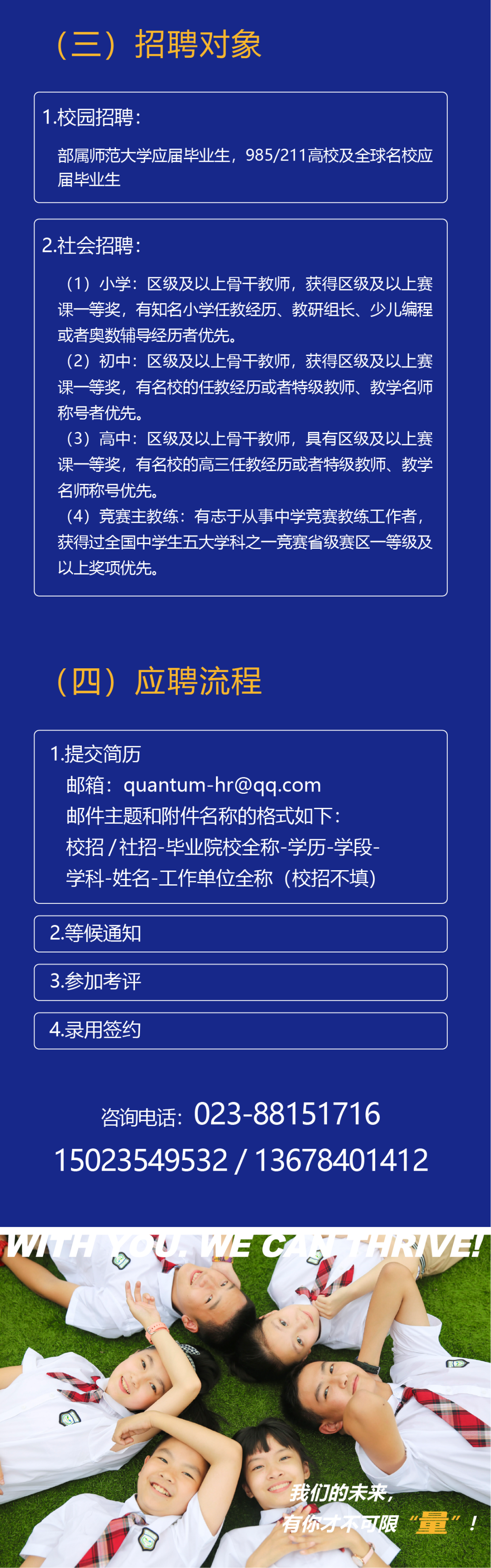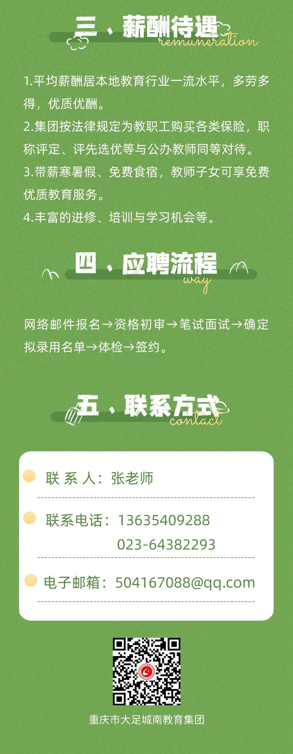 三、招聘条件 1.具有中华人民共和国国籍,热爱祖国,遵纪守法,品行端正,作风正派; 2.热爱教育事业,服从分配,具有吃苦耐劳、乐于奉献、团结协作精神; 3.原则上35周岁及以下,特别优秀可适当放宽(保育员可放宽到50岁以下); 4.身体健康,无残疾、传染病、精神病史。 四、招聘程序 1.报名截止时间:2023年9月23日 2.报名程序:本次实行电子邮箱及网络报名,请有意者将自己的学历证书、资格证书、获奖证书扫描件(或照片)及附件1报名登记表QQ邮箱1071647276@qq.com,不接受邮箱咨询。 3.面试考核:学校依据资料初审,初审合格者电话通知面试,面试地点为彭水职教中心,汽修、数控类教师面试内容为本专业任一教学内容试讲+评委现场提问+实操考核,幼儿教师面试内容为现场展示+评委现场提问,面试时间2023年9月25日。 4.体检:面试合格后,应聘人员自行到二甲及以上医院体检,体检费应聘人员自理。 5.公示:面试完毕后两个工作日内公布聘任结果。 6.聘用:经公示无异议或经核实不影响聘用的拟聘人员,根据《劳动法》《中华人民共和国劳动合同法》文件相关规定签订《劳动合同》,确立聘用关系,完善聘用手续。 公开招聘的人员按规定实行试用期,试用期为一个月,试用期包括在聘用合同期限内。试用期满合格的,予以正式聘用;试用期内或试用期满考核不合格或发现隐瞒前病史且身体条件不符合岗位要求以及提供虚假材料的人,取消聘用资格。 学校可根据岗位实际,对拟聘人员实施岗位调配,具体以劳动合同为准。 五、受聘待遇 人员应聘后,需在学校相应时间内到岗,同时根据外聘教师工资制执行基础工资、校龄工资、课时绩效、高技能等级工资、年底考核绩效、购买五险,加入学校工会分会会员,享受工会会员节假日慰问金。教科研奖励按学校相关制度同等对待。 六、其他 1.本公告由彭水自治县职教中心负责解释。 2.请应聘人员保持电话等联系方式正确并畅通,因不提供准确信息、虚假材料等,造成的一切后果由应聘人承担。 3.招聘监督情况及问题反馈信箱315221404@qq.com。 4.联系咨询方式 冉显霞:15223898316 简 讯:15025707117 QQ邮箱:1071647276@qq.com 渝北莲花第二幼儿园创办于2018年4月,是经渝北区教委批准成立的一级公办幼儿园,校园设计新颖,环境幽雅,占地面积约一万余平米,办学规模为18个班,并开设有创意美工室、阅览室、多功能室等。建园以来,幼儿园秉承“莲花盛开 朵朵精彩”的办园理念,从幼儿不同年龄特点及发展水平出发,让幼儿在富有探索性、启发性的环境中学会认知、学会生活、学会合作,深受社会的广泛关注和家长的一致好评!因幼儿园办学规模的不断扩大,现面向社会招聘优秀的幼儿教师到园工作。 ●招聘要求: 岗位:配班教师 学历:大专以上学历(学前教育专业) 要求:性格活泼开朗,具有良好的教师职业道德,喜欢孩子、有爱心、爱岗敬业。 ●招聘时请出示本人身份证(毕业证、教师资格证)、个人获奖等。 ●地址:重庆市渝北区空港乐园B2区民意路36号 ●招聘电话:15808022299(王老师) 13883991929(曾老师) ●邮箱:397418758@qq.com 一、学校简介 渝北区五星路小学,毗邻碧波荡漾的双龙湖,紧挨蓬勃发展的空港新城,是一所六年制公办小学。学校致力于“以人为本”的管理,强调通过全员的、持续的、终身的学习,提高团队的学习能力、研究能力和创造能力,致力于“学习型学校”“书香校园”建设,把“让生命因学习而精彩”的理念溶于学校特色文化建设之中,把发展作为第一要务,把科研作为第一动力,把教师作为第一资源,将“文”春风化雨般地“化”入环境中,“化”入管理细节中,“化”入校园的每一个角落,组成学校发展的灵魂,凸显学校的办学品牌,彰显学校的文化品位。学校秉承“让每一位学生体验学习的快乐,让每一位教师享受教育的幸福”的教育理念,以“五彩缤纷,星光灿烂”为办学宗旨,以“让生命因学习而精彩”为校训,以“学习型学校、书香校园”构建为特色,彰显“我努力,我与五星共成长;我成才,我为五星添光彩;我自豪,我是五星人”的五星精神,先后荣获市、区级先进集体、区级学习型单位、示范校等荣誉。 二、招聘岗位 数学教师1名(数学相关专业)。 三、招聘要求 1.身心健康,作风正派无任何纪律处分记录。 2.热爱小学教育,具有良好的职业道德修养。 3.本科及以上学历,取得小学教师及以上资格证,二级乙等及以上普通话证书。 4.有2年学校工作经历者优先。 四、招聘程序 1.简历投递:有应聘意愿的老师请关注公众号:教师行业资讯,然后将身份证、学历学位证书、教师资格证书、相关获奖材料电子件连同个人简历打包发送至邮箱:465553303@qq.com,文件命名格式“学科+姓名“。 2.报名时间:2023年9月20日-2023年9月22日,报名截止时间2023年9月22日12:00。 3. 资料初审: 9月22日学校招聘工作小组将对应聘者资料进行初审,初审符合条件的老师,学校将电话或短信通知在指定时间到校进行现场考核,未收到通知者勿扰。 4.现场考核时间及方式: 现场考核时间:2023年9月23日(暂定)。具体时间电话或短信通知。 现场考核方式:学科备课—学科模拟上课(8分钟)—师德师风、教育教学理念和课堂组织教学能力等考察。现场考核结果在2023年9月24日12:00前电话通知。 五、面试提交材料 身份证、学历学位证书、教师资格证书及获奖材料原件。所有材料均需交复印件