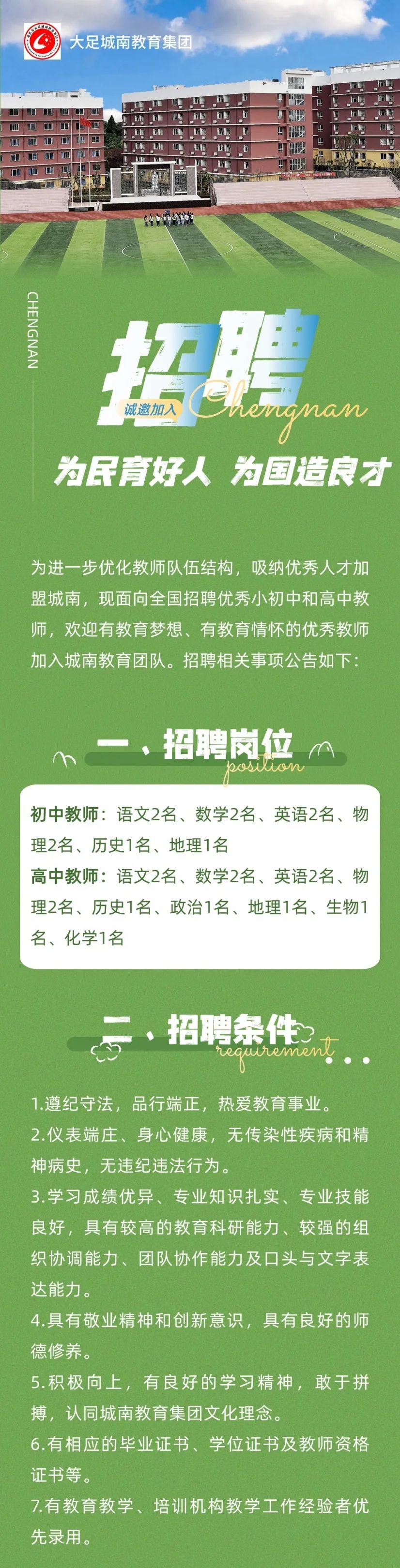 南岸天台岗雅居乐小学招聘小学数学代课老师,在六公里附近,有意者联系邓老师13983779720 投递简历到820193404@qq.com 为了全面推进职业教育高质量发展,加快推进集团化办学,提升长滩幼儿园办学质量,彭水职业教育中心特现面向高校和社会公开招聘相关教师,欢迎有志之士加盟,共谋彭水职教事业。 一、学校简介 彭水自治县职业教育中心是重庆市重点中等职业学校,重庆市中等职业教育改革发展示范校,重庆市高水平项目学校,重庆市双优学校项目建设学校,属国有公办性质,位于彭水县汉葭街道长滩社区,毗邻彭水火车站、包茂高速彭水东站,距重庆主城2.5小时车程。学校占地340余亩,学生6000余人,教职工400余人,现开设有数控、汽修、电子、烹饪、服装、计算机、旅游、幼儿保育、民族工艺品设计与制作、直播电商、康养休闲服务、中医护理等专业。 二、招聘岗位及人数 本次面向社会公开招聘人员9名。具体岗位及要求如下:
