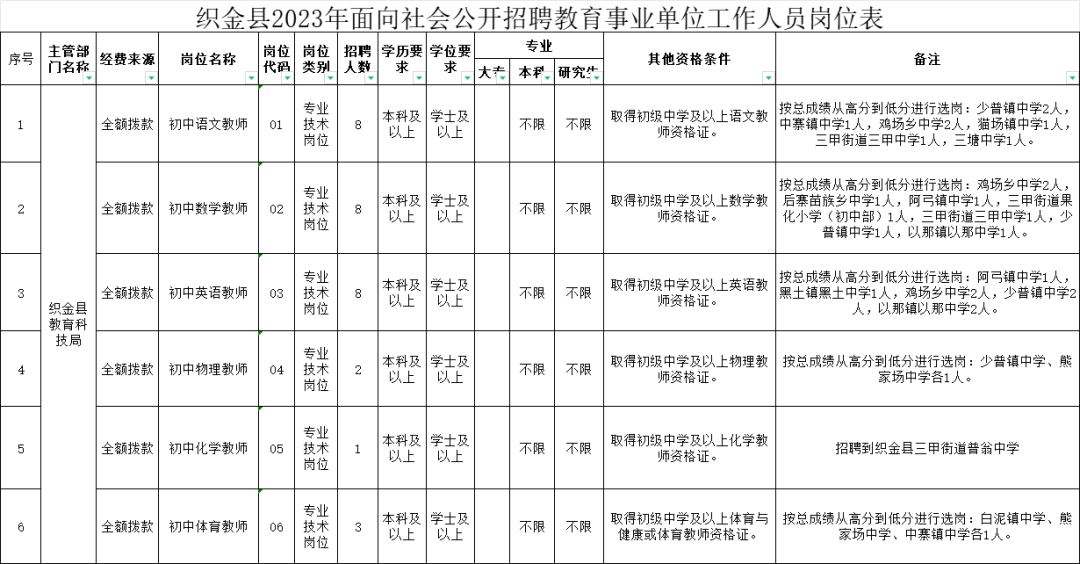 招聘岗位及要求详见《织金县2023年面向社会公开招聘教育事业单位工作人员岗位表》(以下简称《岗位表》,详见附件1),岗位专业要求参照贵州省人力资源和社会保障厅官网上的《事业单位公开招聘专业设置参考目录》设置。
