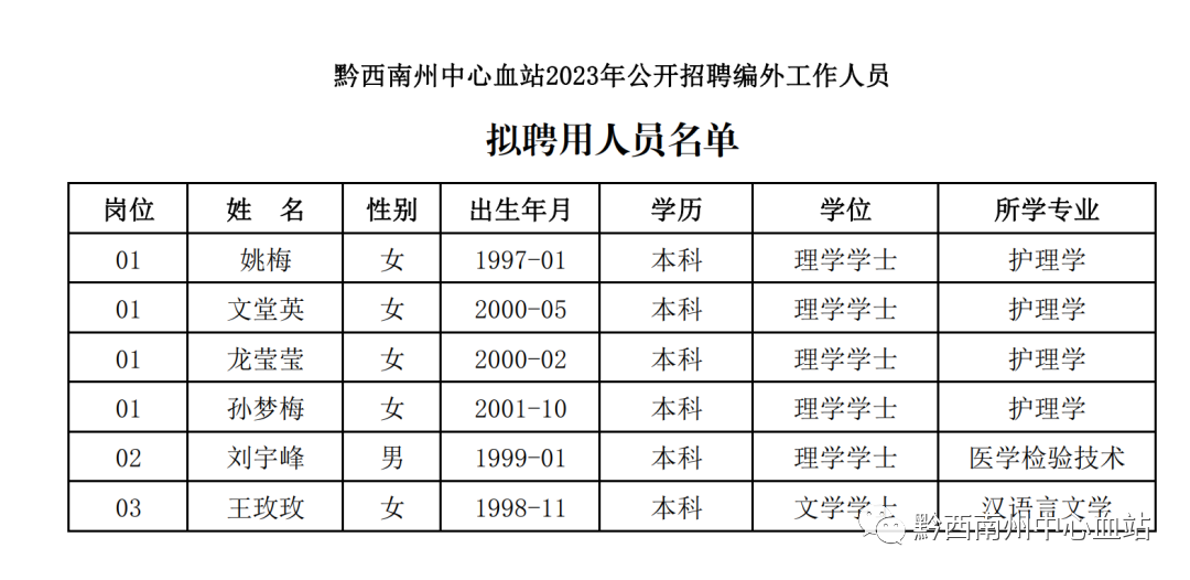 根据《黔西南州中心血站2023年公开招聘编外工作人员简章》规定,资格审查、笔试、面试、体检及考察工作已经结束,现将拟聘用人员进行公示。经公示无异议后,按规定办理聘用手续。