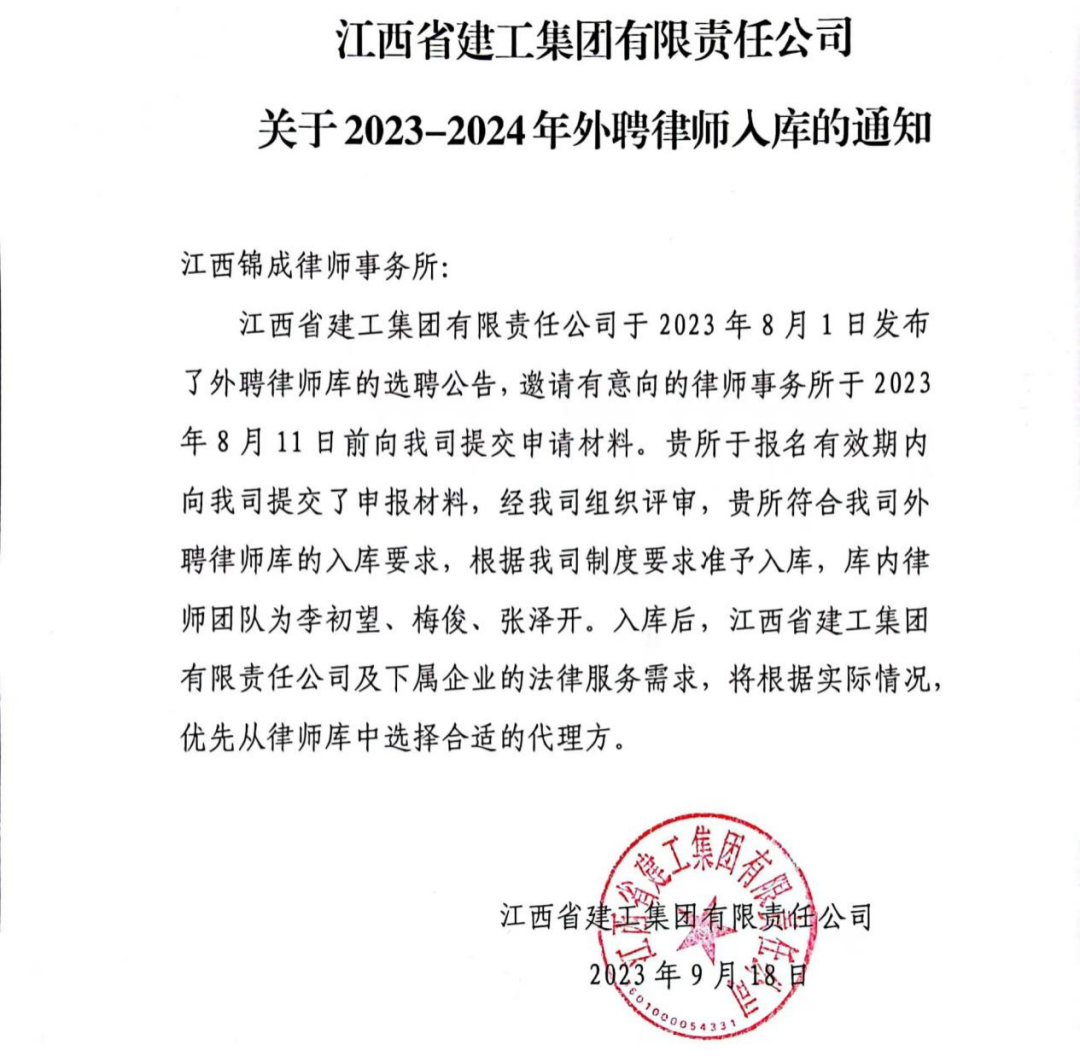经公开选聘,于2023年9月18日,江西锦成律师事务所凭借着热情的服务、专业的素养、丰富的实践经验成功入选江西建工集团有限责任公司外聘律师库。
