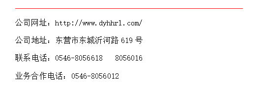 8小时工作制,9:00-18:00(午休1小时),每周双休。 (1)现场报名:报名地点:东营市黄河三角洲人力资源开发中心201室(东营市东城沂河路619号,东二路与沂河路交汇处)。(2)网上报名:应聘人员需将相关报名资料扫描件以“姓名+岗位”命名文件夹发送至dyrcpq@163.com邮箱。点击阅读原文或登录东营市黄河三角洲人力资源网((http://www.dyhhrl.com)下载中心下载《东营市黄河三角洲人力资源中心报名登记表》,报名时需提交报名登记表1份(贴近期1寸彩色免冠照片),身份证、学历证书等材料。各种证件、证明材料须提供复印件各一份。0546-8056618/8056016  |