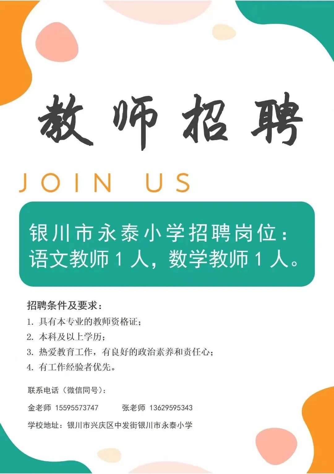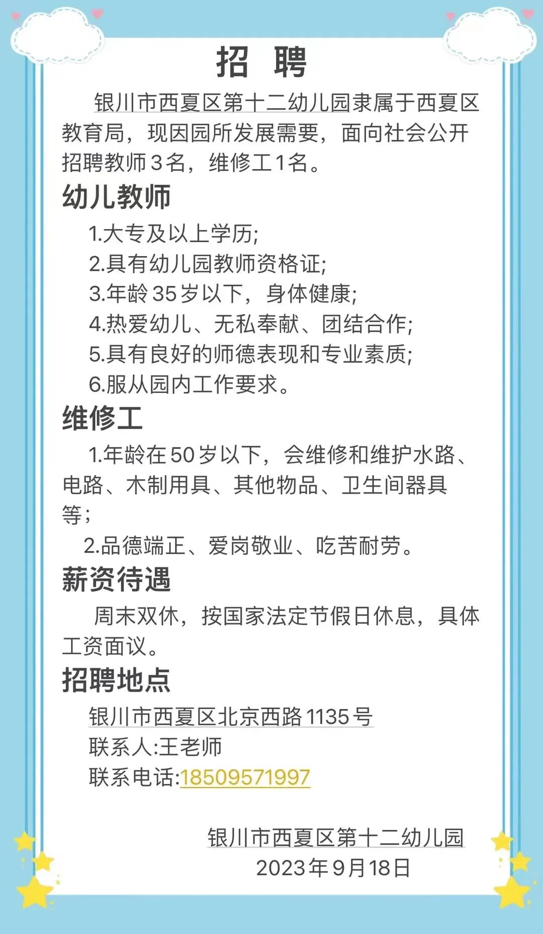 银川职业技术学院2023年招聘教职工通勤车司机公告 根据学院工作需要,银川职业技术学院面向社会公开招聘专职司机1名。具体要求如下:(二)持有A1驾照,具有50座以上大巴车10年及以上驾驶经验。(四)身体健康,吃苦耐劳,有爱心、责任心和良好的沟通理解能力。(五)具有公交公司或长途客运驾驶员等相关工作经验者优先。(一)发送个人电子简历至yczjxy@126.com(简历中注明本人联系方式)或将个人简历及相关证书复印件交至学院行政楼709室(本人身份证、驾照、工作经历、学历证书、联系方式等)。(二)报名时间:2023年9月20日至2023年10月20日18:00。(一)时间:2023年10月下旬(如有变动,另行电话通知);(四)提交材料:身份证、驾照、毕业证、工作经历证明;提供本人有无违纪违法证明;提供个人征信证明等方面的考察材料;提供原单位工作表现证明材料。按照《银川职业技术学院编制外聘用人员管理办法》执行。(一)报名提交的材料须真实、准确。提供虚假材料一经查实,取消招聘资格。(二)报名人员提供的联络方式须有效、准确,便于随时联络、通知面试等有关事宜。如因个人原因无法联系,未按时到场,视为自动放弃。银川市永泰小学教师招聘公告