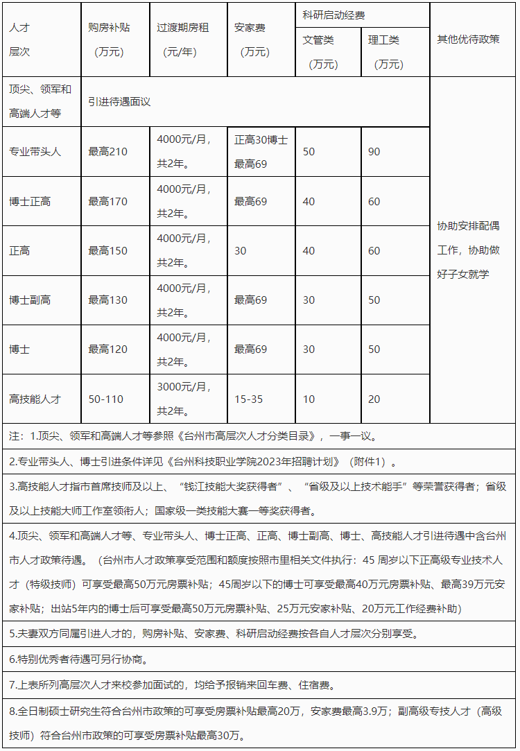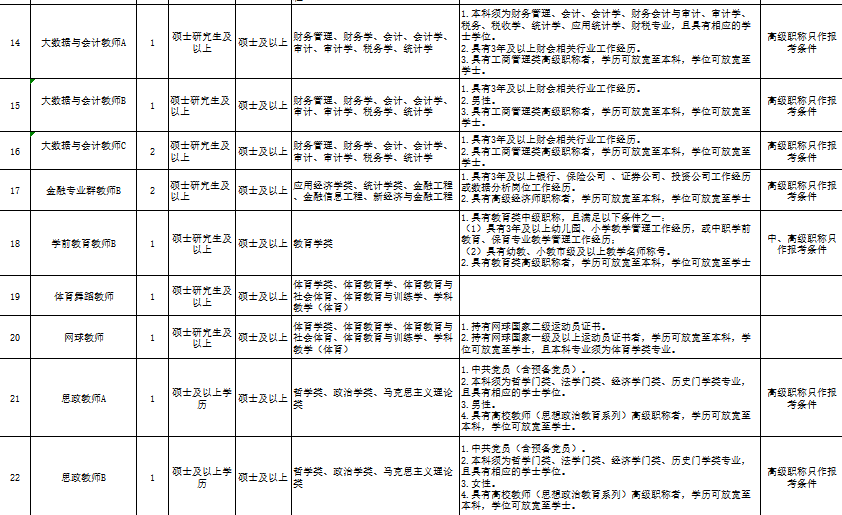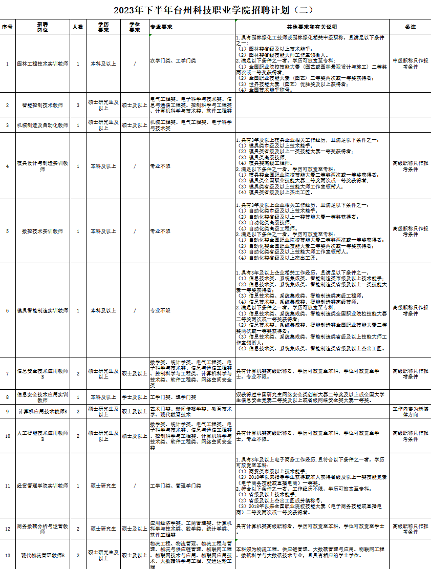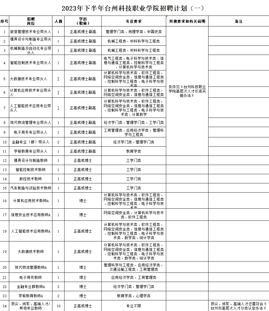 一、单位简介 台州科技职业学院位于浙江省台州市,是一所由政府举办的全日制普通高等学校,公益二类(全额补助)事业单位。 二、招聘岗位及条件 (一)招聘岗位 此次拟公开招聘人员67名。具体招聘岗位、人数、条件等要求如下: ![]() ![]()