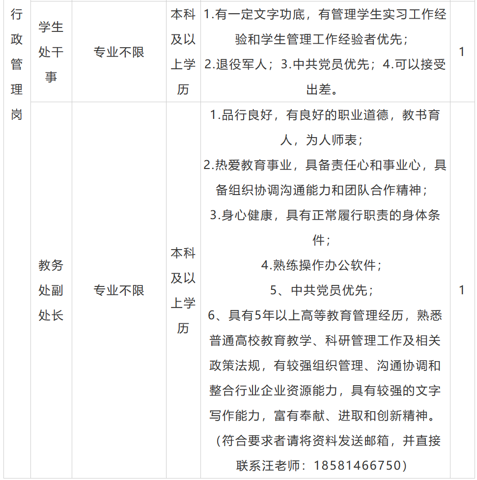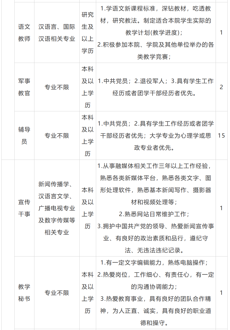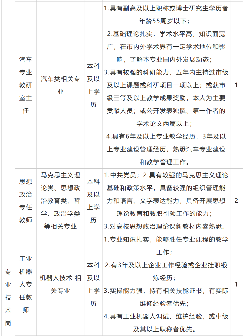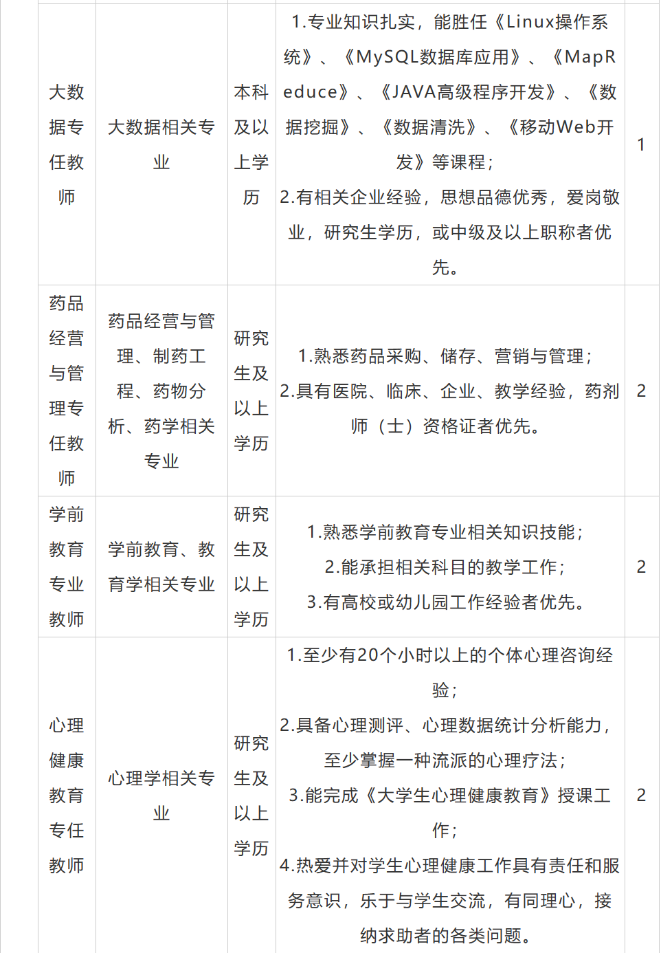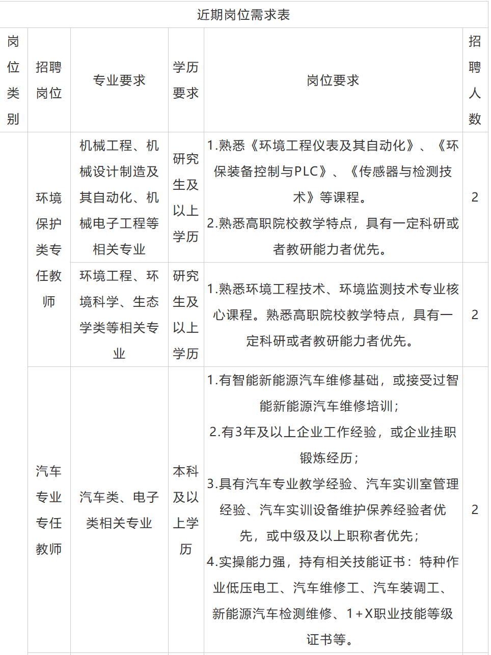 重庆资源与环境保护职业学院是重庆市人民政府批准设立,教育部备案,重庆市教委主管的全日制普通高等院校,是一所资源环境专业特色鲜明的高等职业学校。 二、招聘岗位及条件 ![]() ![]() ![]() ![]() ![]() 三、报名方式 1.应聘者请将PDF版简历,和身份证、学历(学位)证、等级证书、荣誉证书扫描件,压缩打包,压缩文件与邮件标题命名为“应聘岗位+姓名+学历+专业+高校人才网”发送至cqzhxy_hr@163.com。【快捷投递:点击下方“立即投递/投递简历”,即刻进行职位报名】 2.本公告本年度长期有效。 3.应聘人员资格初申通过后,根据通知做好试讲、面试准备。 4.见习期(试用期)满,经考核称职者,办理转正手续。 四、薪资福利 1.按国家规定签订劳动合同,享受国家规定的五险一金;学校薪酬体系完善,配套各类津贴、奖金、节日福利,为教职工提供住房补贴、话费补贴、工作餐。 2.按照学校规定享受带薪寒暑假,日常执行国家法定节假日和双休制度。 3.具备良好的发展平台,为教师提供国家级专业培训、专业顶岗培训、精品课程培训等各项培训机会。按照上级部门相关政策统一组织高校教师资格证考试认定,学校具有高校系列教师职称评聘自主权,组织专业职称评审工作。 PS:敬请投递时标注信息来于"重庆微招"公众号,谢谢! 欢迎联系职位发布:2747986045@qq.com (不接收简历)